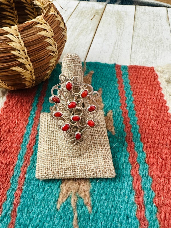 Navajo Sterling Silver & Coral Abstract Statement Ring