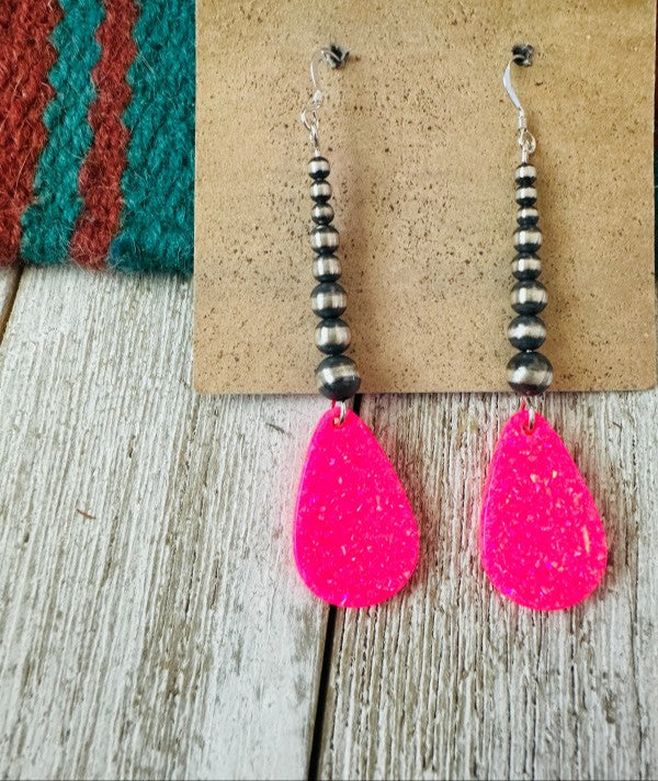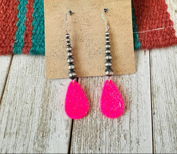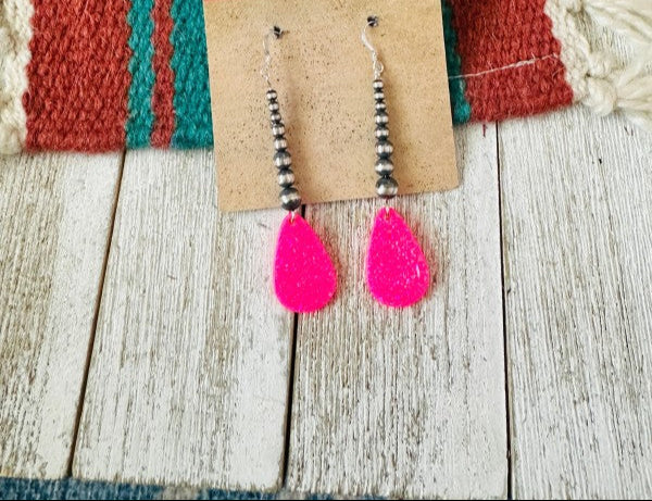 Add a pop of vibrant charm to your collection with these stunning Navajo Sterling Silver Pearl beaded earrings, featuring eye-catching pink opal teardrops. Handcrafted with genuine sterling silver and traditional Navajo artistry, each earring measures approximately 3 inches long and 5/8 inch wide. Perfect for adding a bold, playful twist to any outfit while honoring timeless Native American craftsmanship.