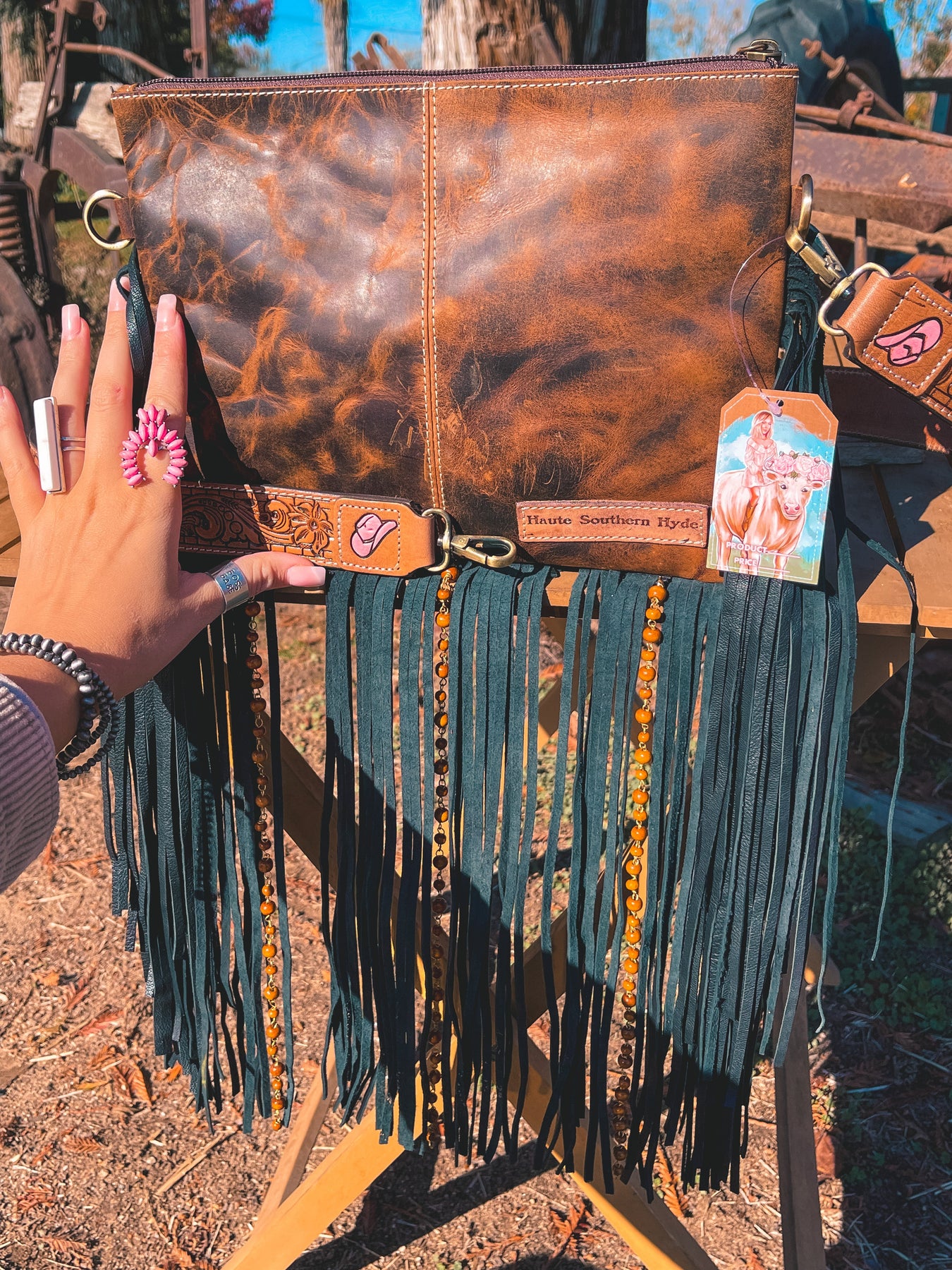 She features a cowhide body, leather back, a painted tooled leather piece, a zipper top, a tooled matching strap, and an optional card holder *sold separately.