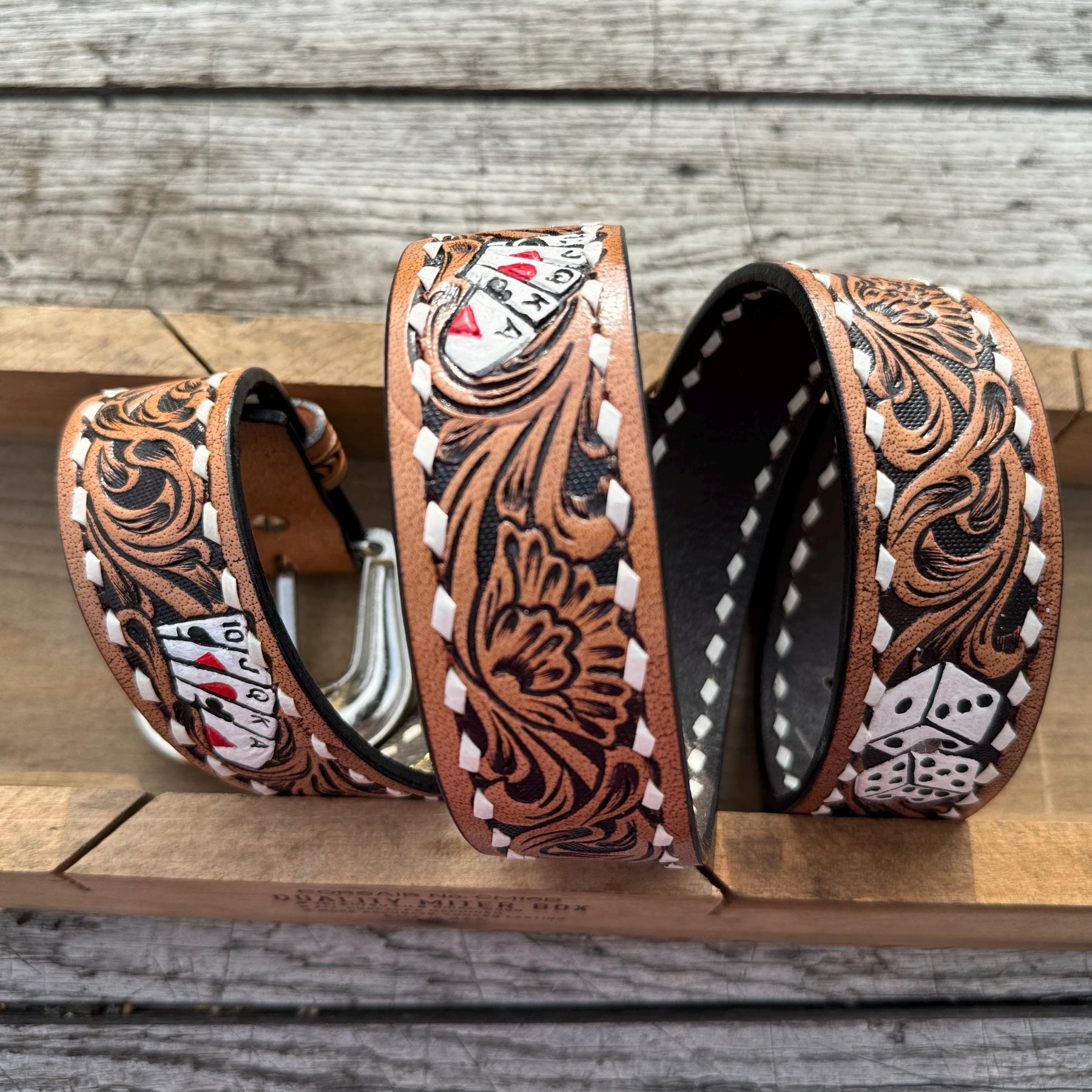 Belt Features: Genuine Leather, Black and Tan Tooled details, Aces and dice, white buck-stitch details, Antique silver buckle. Buckle is removable.