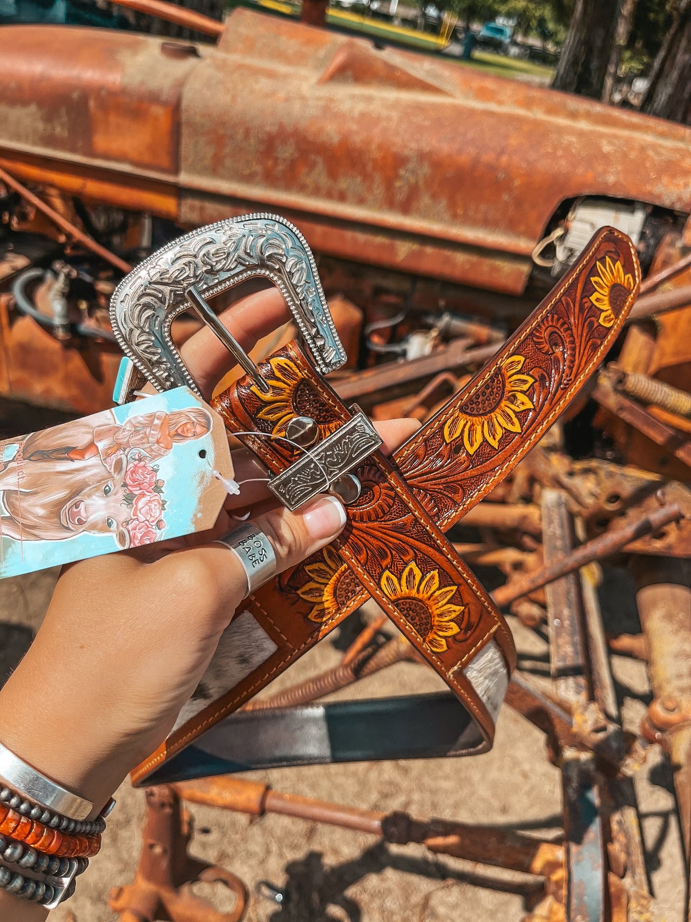 Bring a little sunshine to your wardrobe with our handcrafted tooled leather sunflower belt. Each piece is meticulously detailed with vibrant sunflower tooling, finished in warm honey tones and rich brown leather for that authentic Western flair. Whether you’re dressing up your favorite denim or adding a rustic touch to a flowy dress, this belt is a showstopper from every angle.