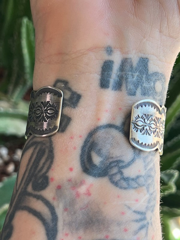 Handcrafted by renowned Navajo silversmith Murphy Platero, this stunning cuff bracelet is a true work of wearable art. The split sterling silver band is beautifully hand-stamped with intricate Southwestern designs, tapering from 3/4" at the ends to 1-3/8" at the center.