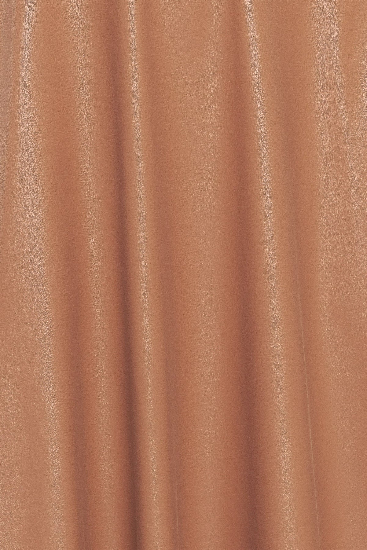 A faux leather midi dress featuring round neckline, sleeveless, circle skirt and back zipper closure