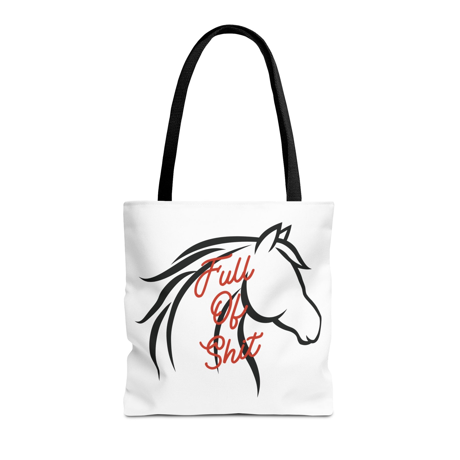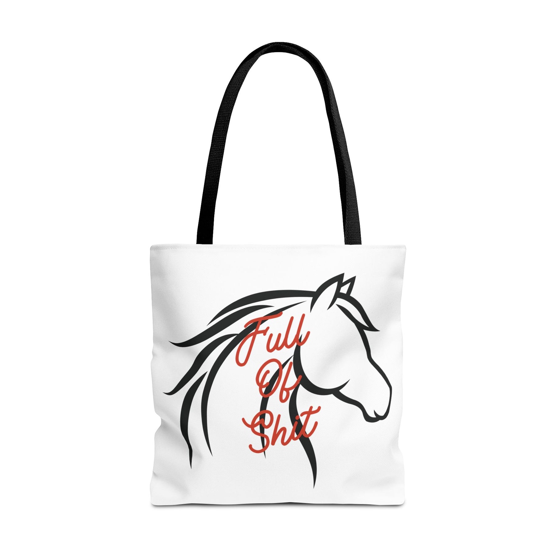 Bring a little barn humor everywhere you go with the “Full of Sh*t” Horse Silhouette Equestrian Canvas Tote Bag — because horse people get it.