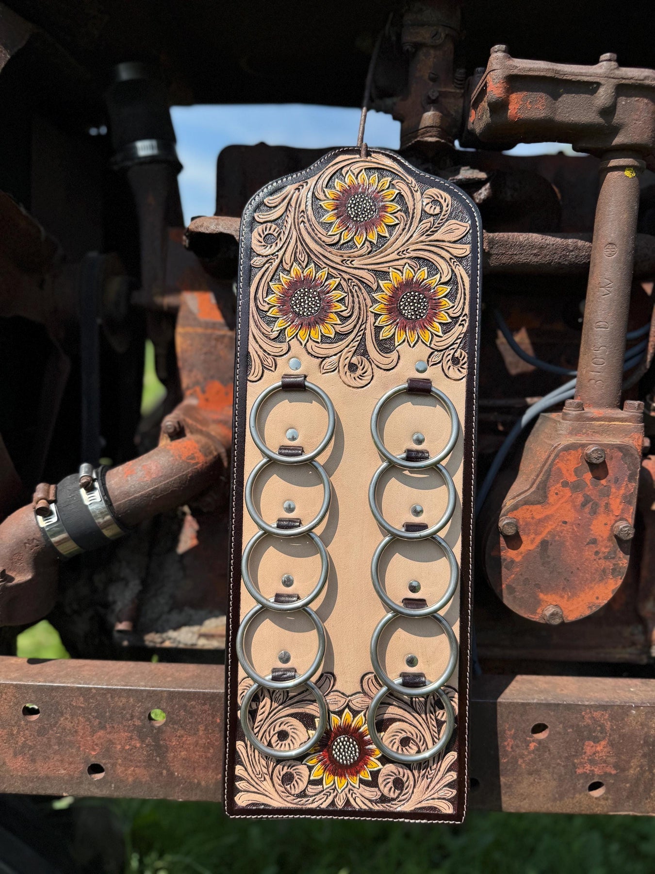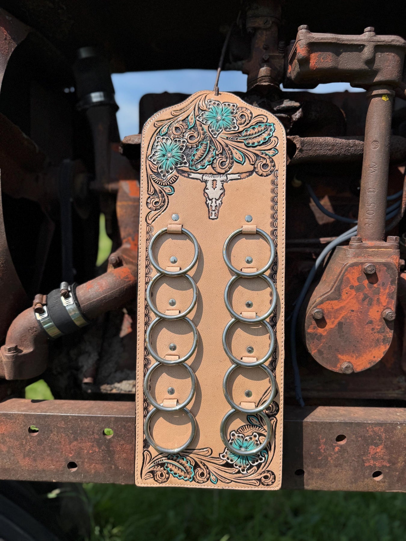 Our wild rag holder is made of thick hand tooled genuine cowhide leather. Not only will this item keep your wild rags gathered, but also pairs as a beautiful home decor item.