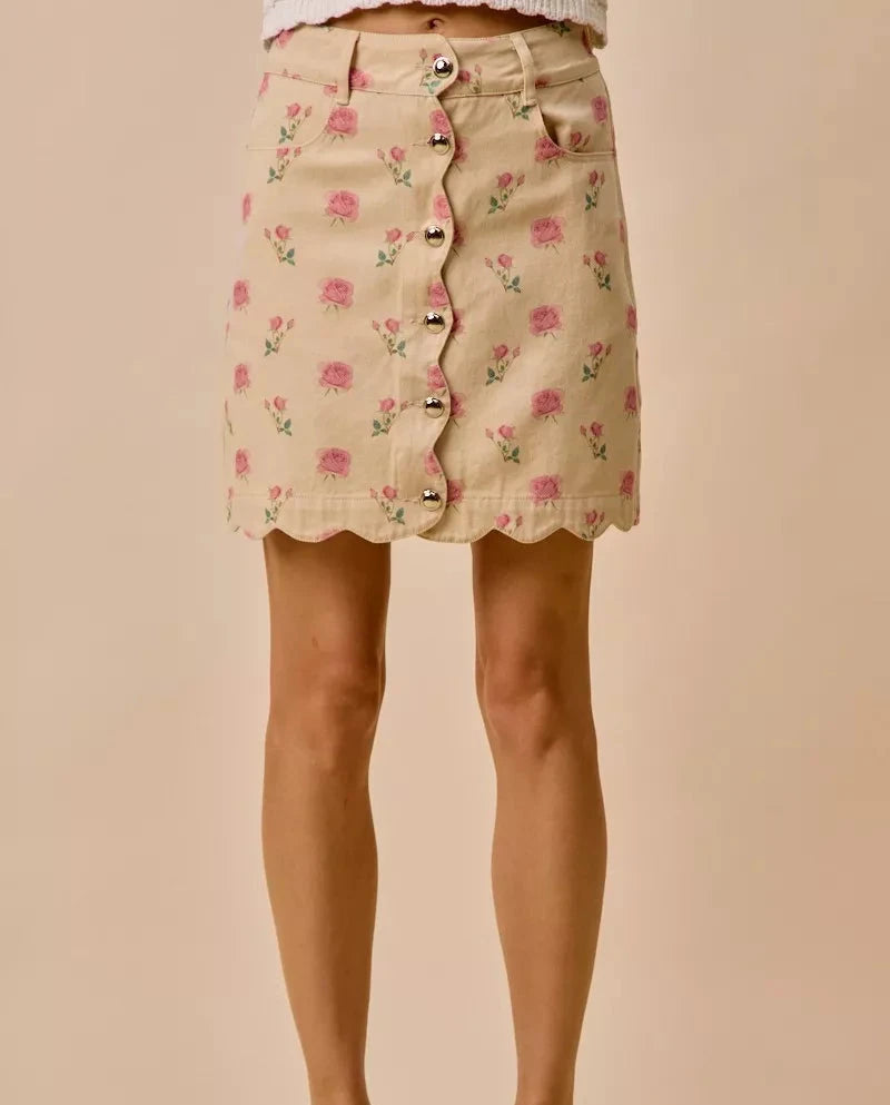 Floral Rose Print Cotton Twill Scallop Mini Skirt