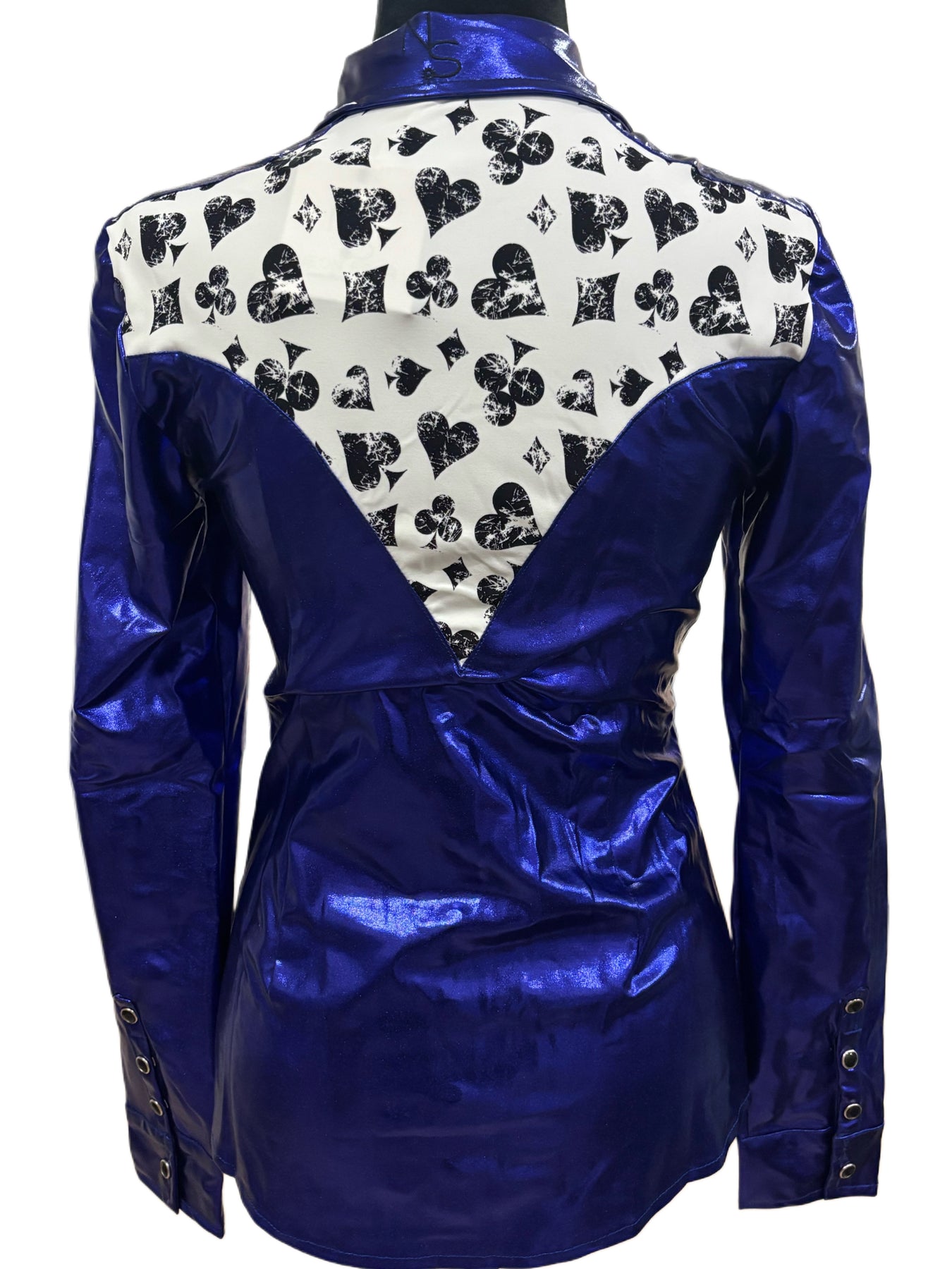 Get ready to turn heads in the Royal Flush Rodeo Shirt, where high-stakes style meets rodeo royalty. This Neon Spur Exclusive brings western edge and Vegas glamour together in one knockout piece. Featuring a deep indigo metallic bodice and a distressed playing card suit pattern across a bold, dramatic V-shaped yoke, this shirt deals out confidence with every move.