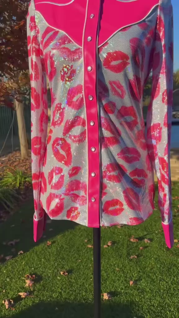 The Smooch & Spur Rodeo Shirt is where glam meets grit. Designed with a form-fitting, body-contour silhouette and crafted from buttery-soft 4-way stretch holographic fabric, this shirt moves with you—whether you're in the saddle or stealing the spotlight.