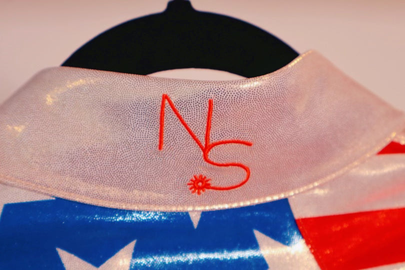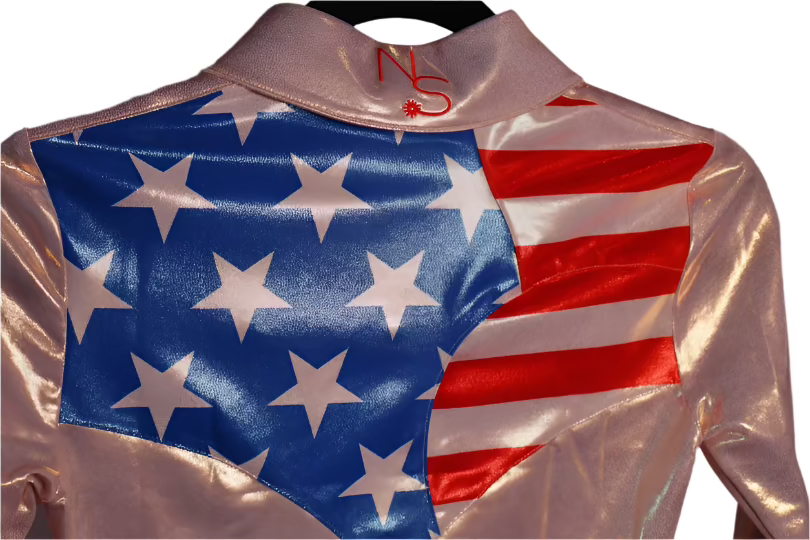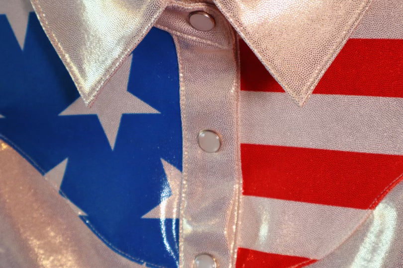 - Patriotic Yoke Design: The standout feature is the avant-garde USA flag-inspired yoke. On the right, royal blue metallic shimmer panels are adorned with pearl white gold stars, while the left showcases ruby red shimmer metallic and pearl gold stripes. This bold, modern twist on a classic design celebrates the patriotic spirit in style.