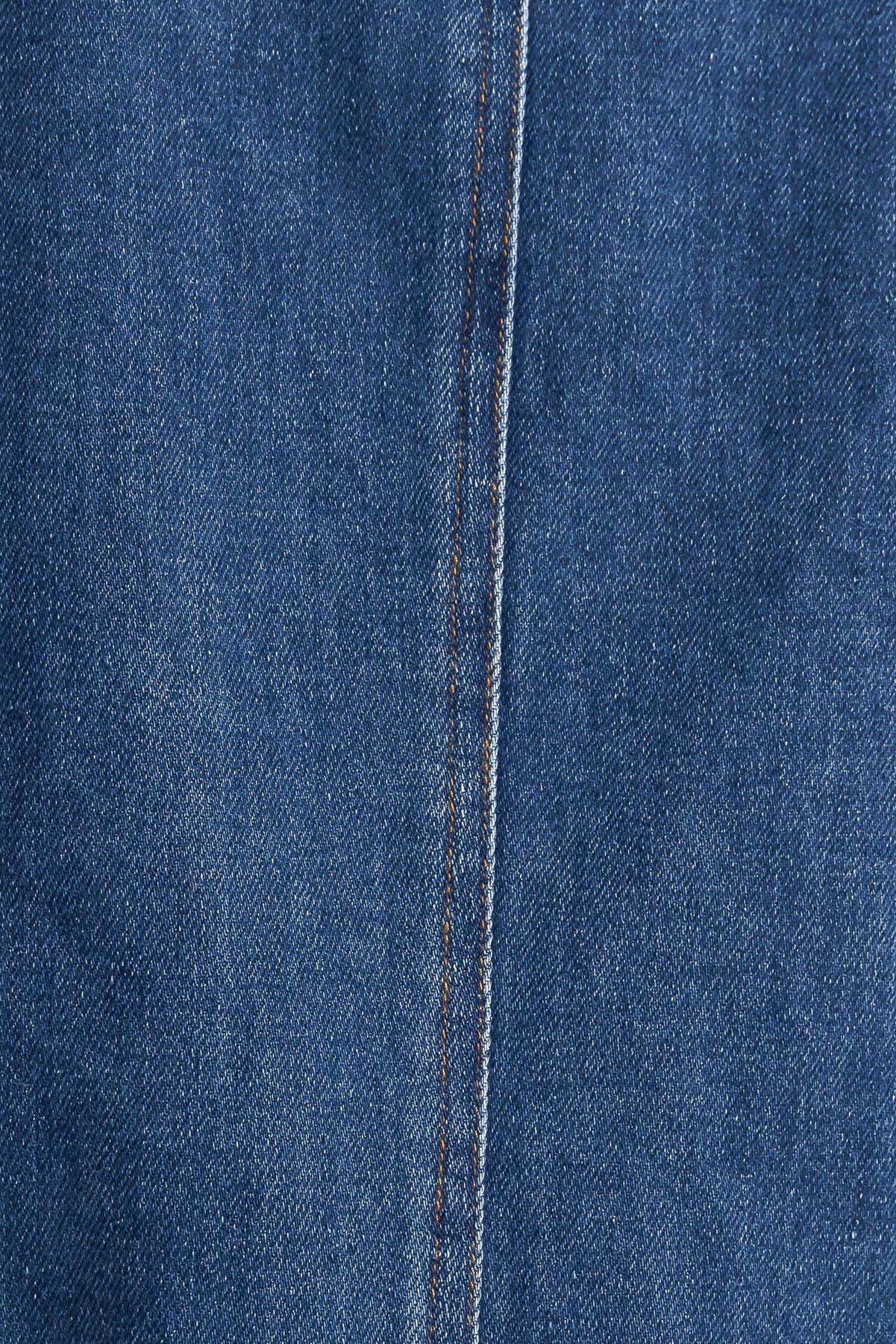 A washed denim jacket featuring round neckline, braided trim and hook & eye closure