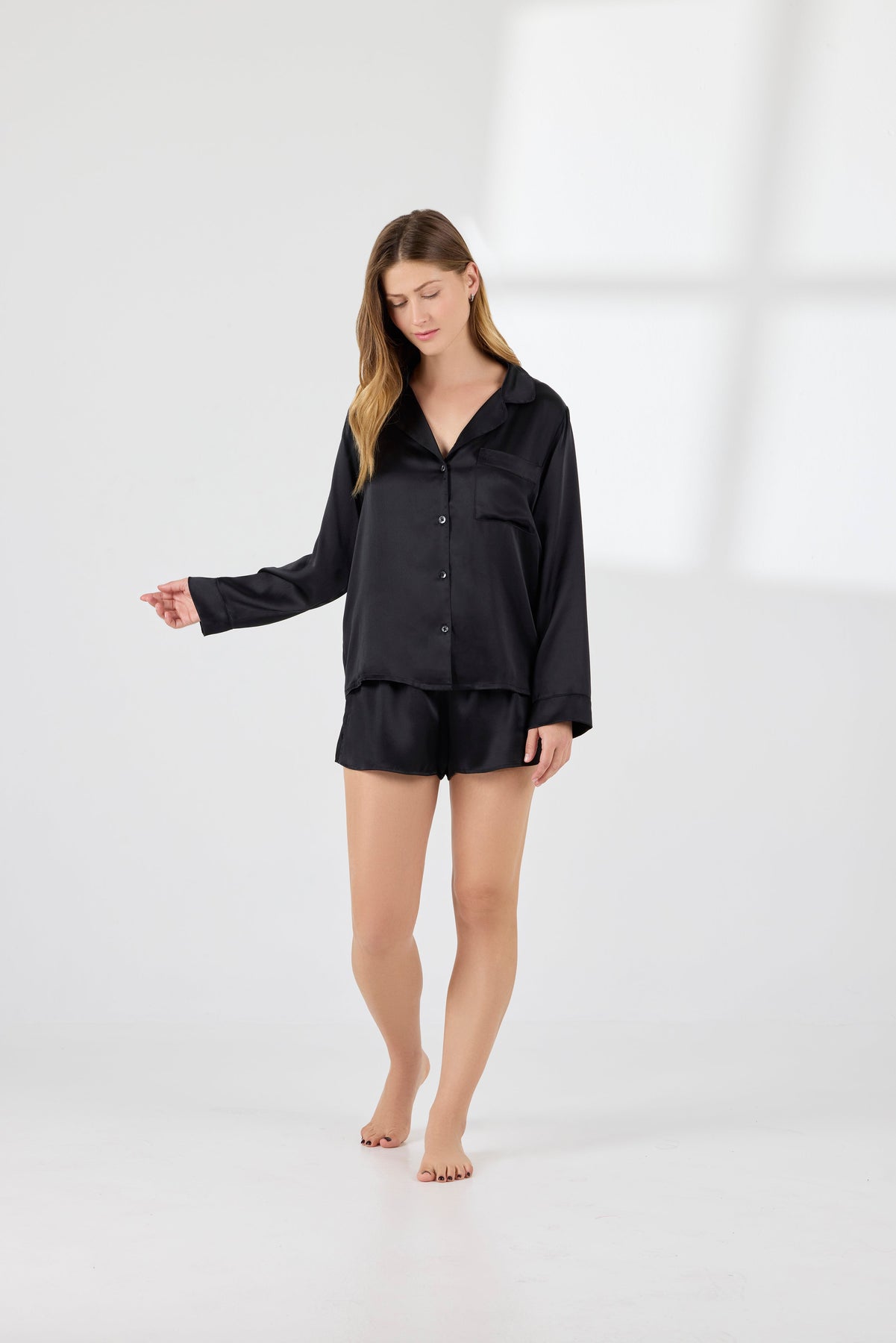 A forever staple, this silk pajama set pairs a classic button-up top with front pocket and paired with airy shorts for effortless style and comfort. The shorts feature subtle side slits and a comfortably stretchy waistband.