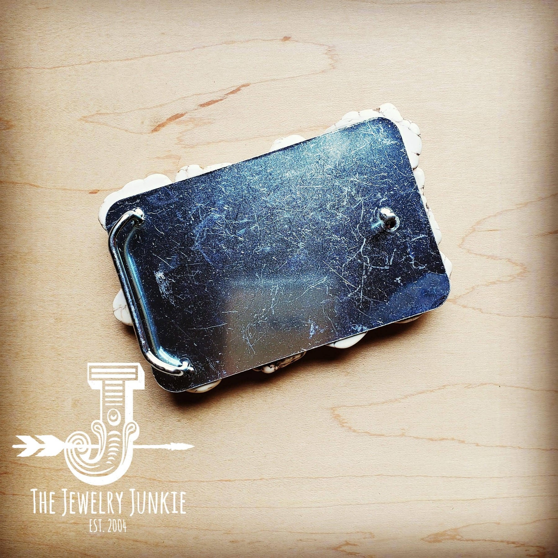 Add a touch of boho charm to your look with this unique statement piece. Handmade in the USA, each buckle features genuine white turquoise slabs for a bold yet earthy style. No two are alike, making your buckle truly one-of-a-kind.