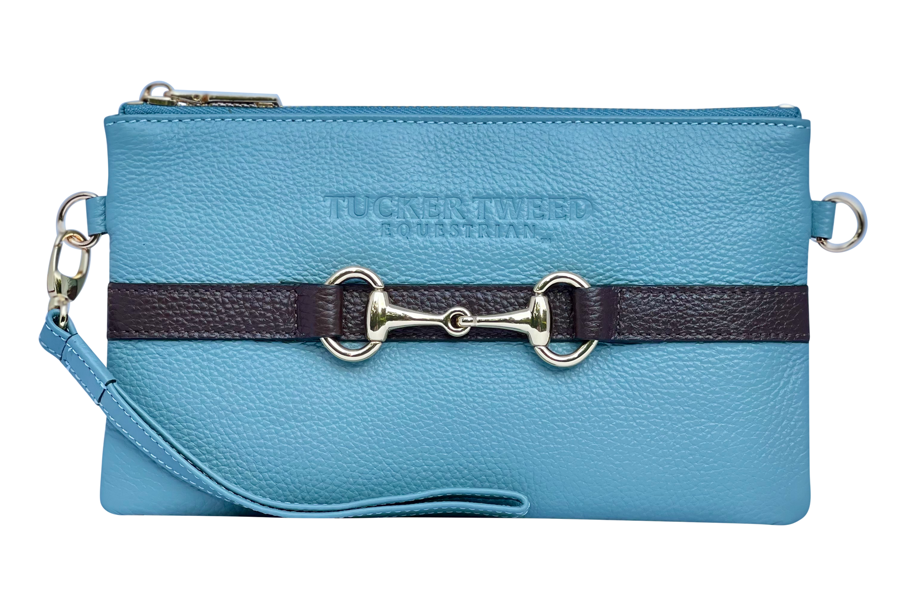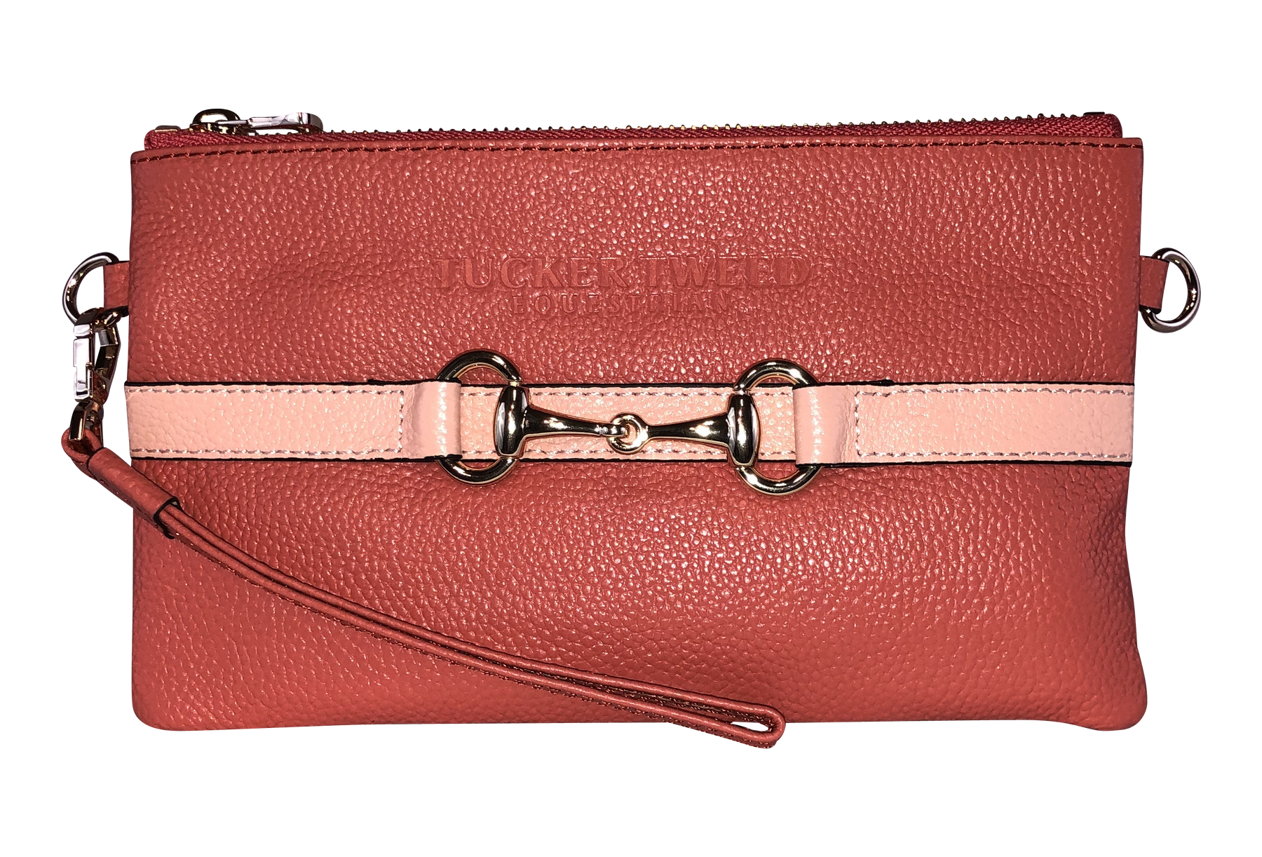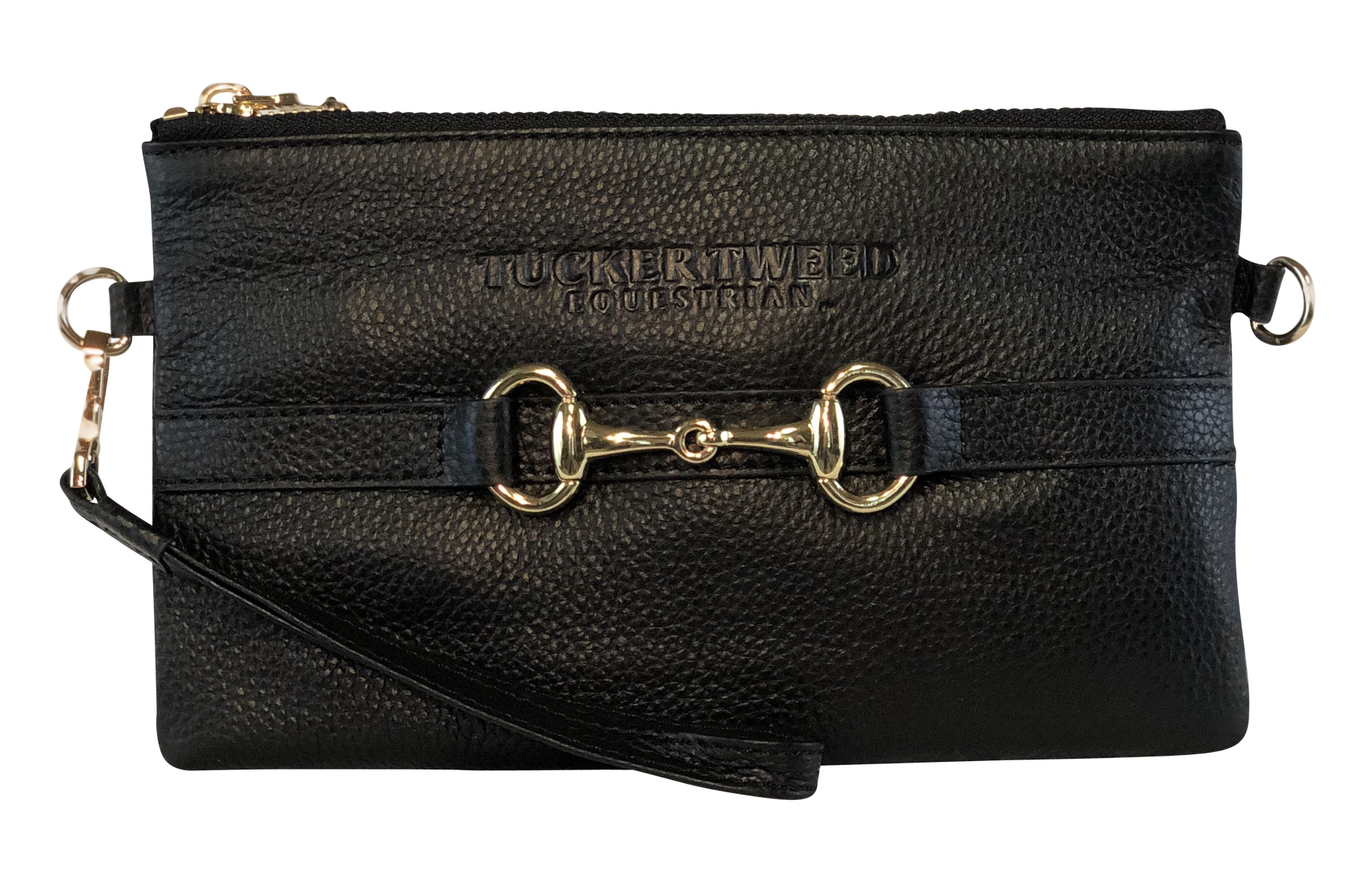 Complete in fine pebble-grain leather, this rider-requested style is available in 20 colors with solid or contrast color accents and snaffle bit detail. The wristlet interior is lined completely in signature red with leather accents, featuring 6 card pockets, bill pocket, a private zipper pocket and room for the largest of cell phones. A removable wristlet strap can attach on the side, on the zipper, or remove for clutch carry. An adjustable shoulder strap is also provided for a crossbody carrying option. Versatile, simple, equestrian luxury.
