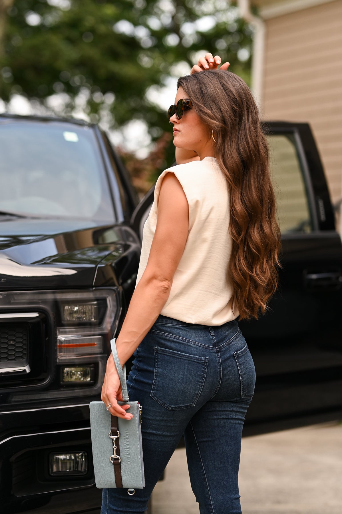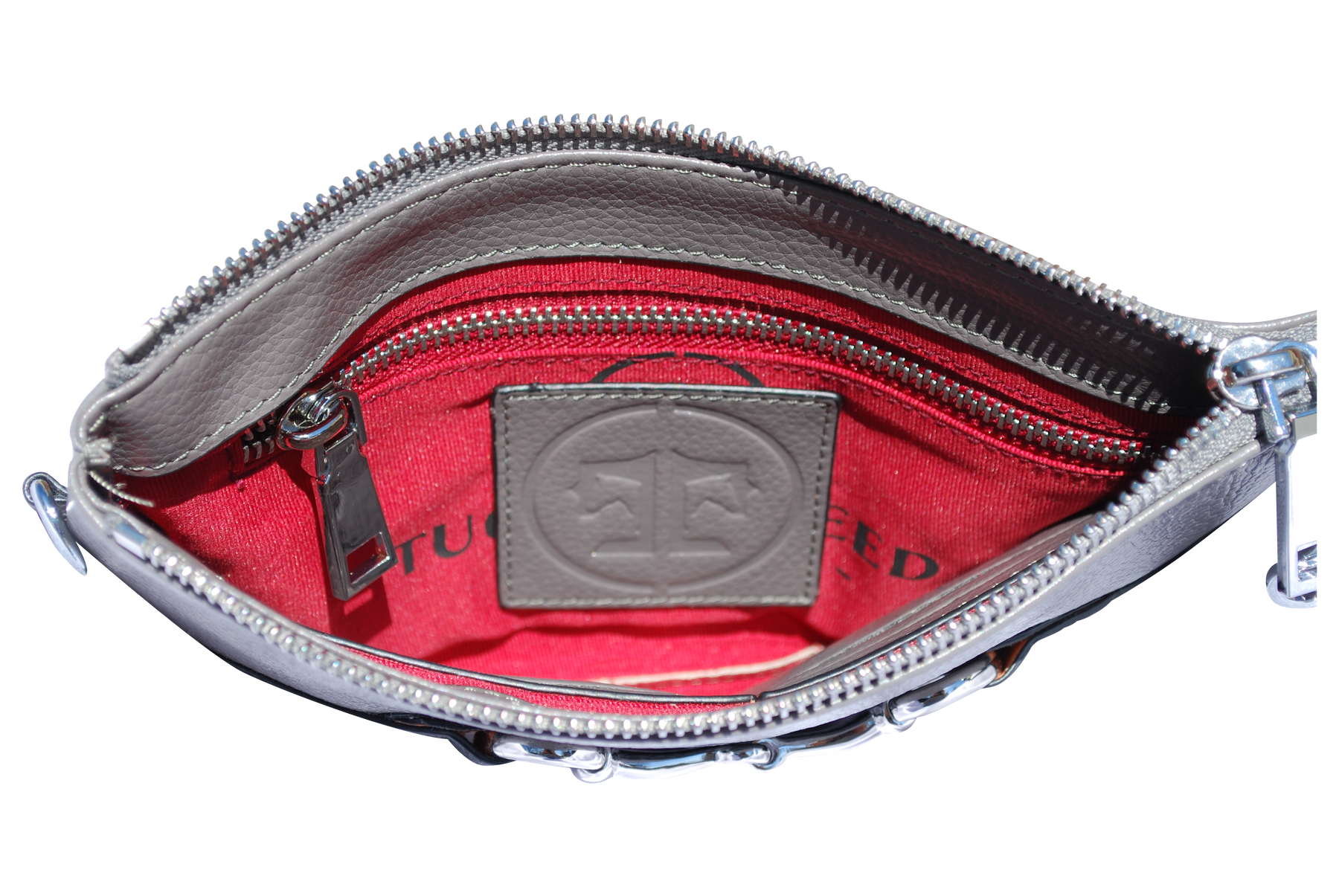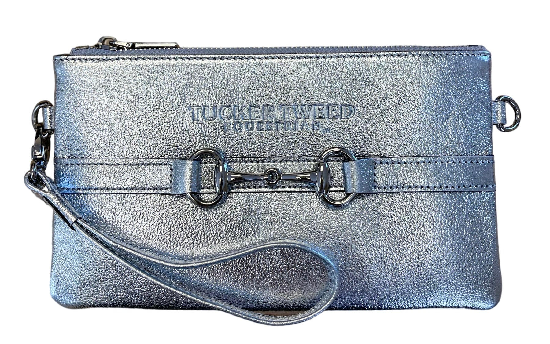 Complete in fine pebble-grain leather, this rider-requested style is available in 20 colors with solid or contrast color accents and snaffle bit detail. The wristlet interior is lined completely in signature red with leather accents, featuring 6 card pockets, bill pocket, a private zipper pocket and room for the largest of cell phones. A removable wristlet strap can attach on the side, on the zipper, or remove for clutch carry. An adjustable shoulder strap is also provided for a crossbody carrying option. Versatile, simple, equestrian luxury.