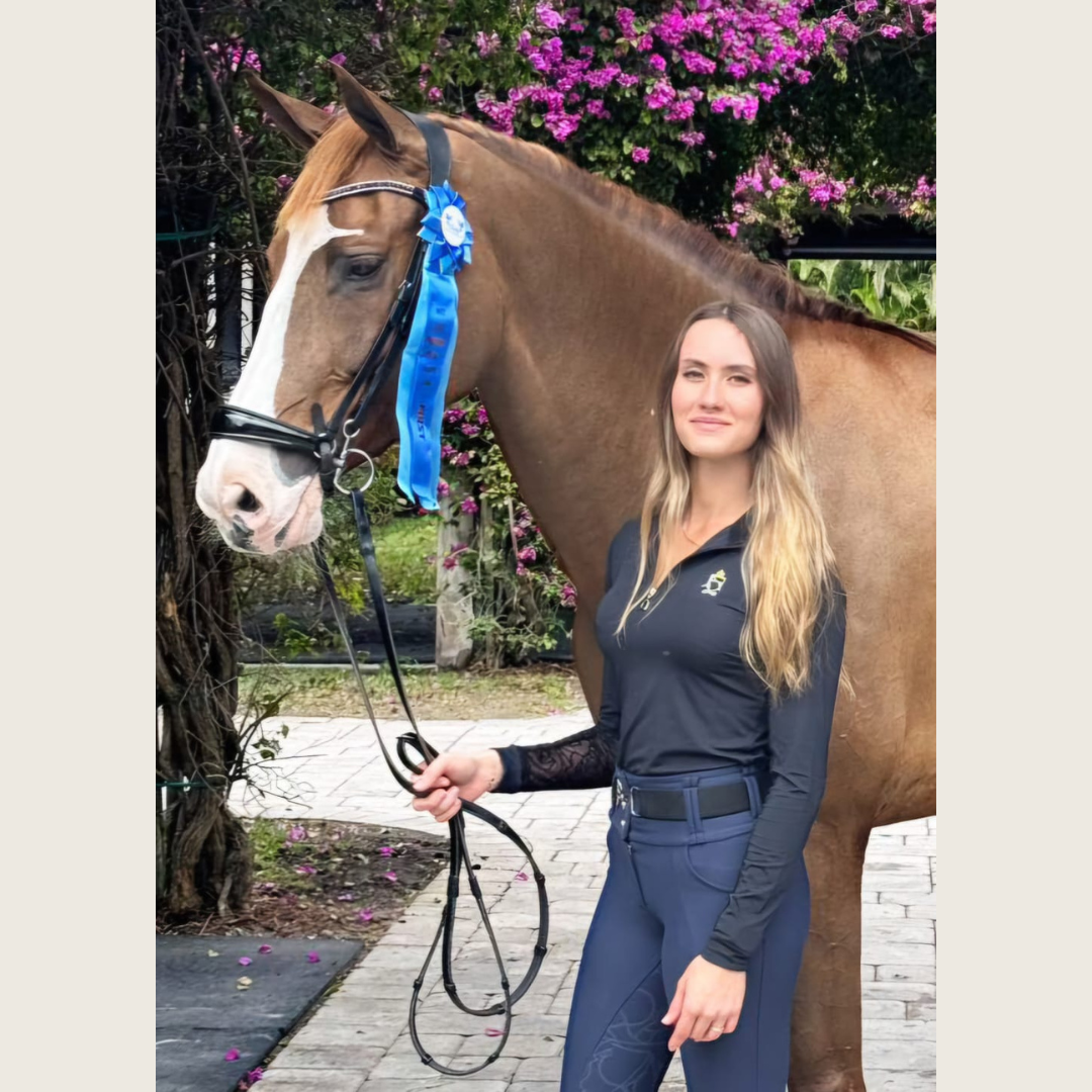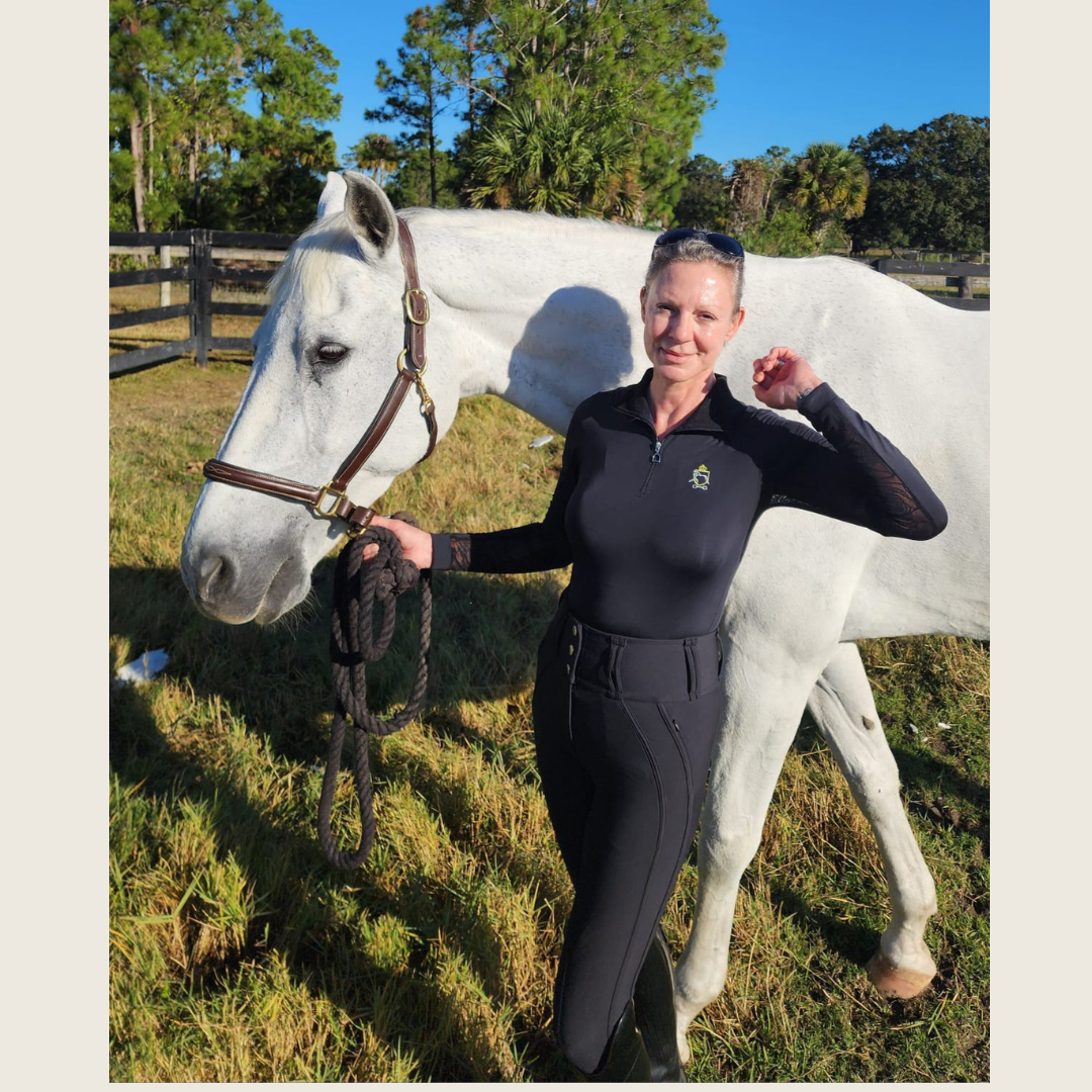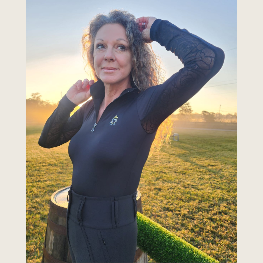 A beautifully fitted silhouette hugging, all black riding shirt designed down to the details with a black lace lined collar and silver colored stirrup zipper pull made from a spandex and a brand new extra silky, super light 100% recycled nylon material. 30UV sun protection with our signature rose lace mesh underarm panels to keep you cool. Save the planet and look gorgeous doing it while riding, schooling, or around town.