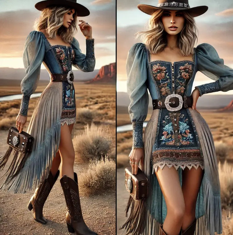 Combining different fabrics is a great way to modernize a classic western dress. Image pairing rugged denim with delicate lace—a truly intriguing and adventurous concoction that balances femininity and edge. This fusion speaks to the versatile nature of modern fashion, allowing you to express different facets of your personality with just one outfit.