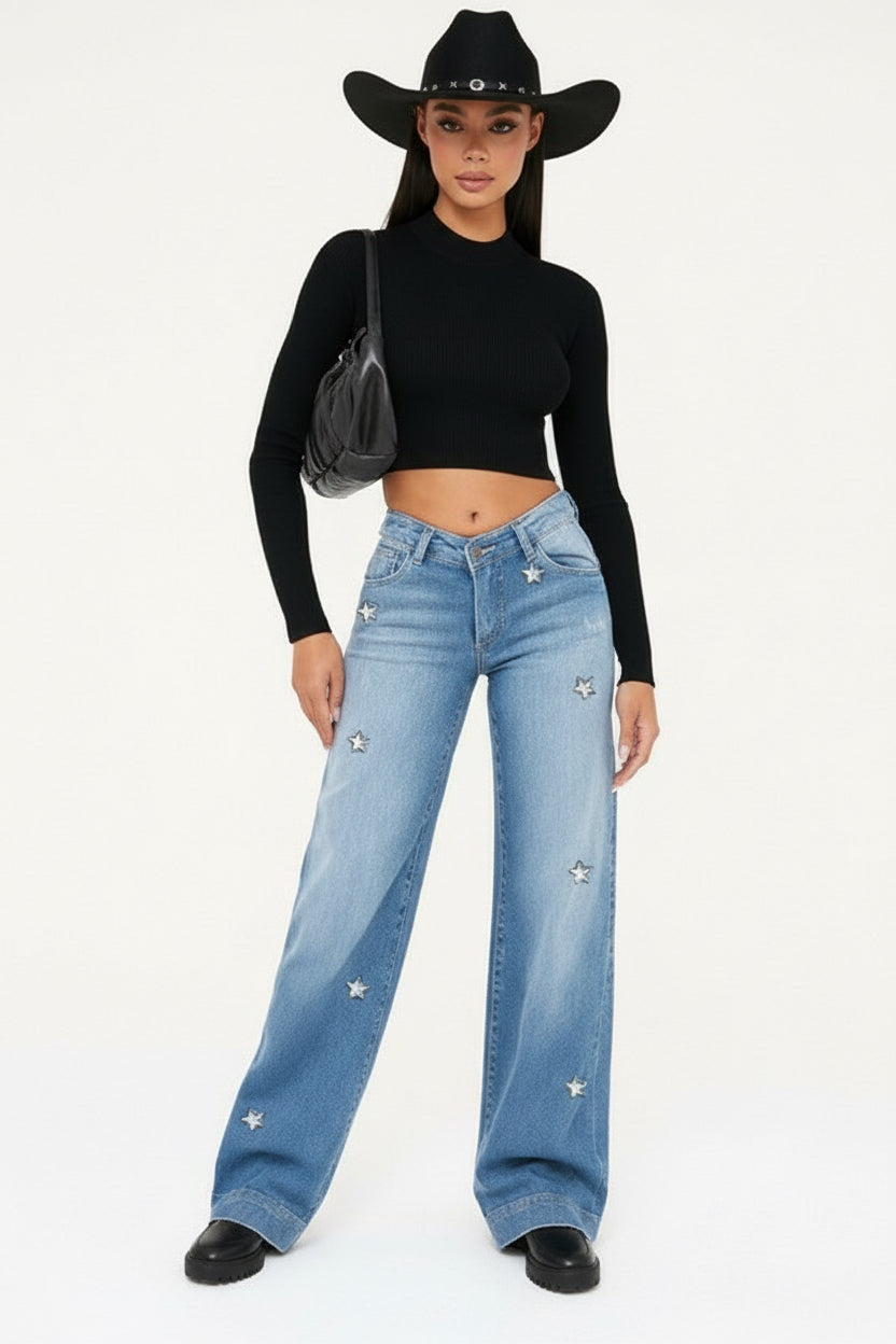 Make a statement in these low rise wide leg jeans, designed to stand out with sparkling star diamond stud accents throughout. Crafted in the USA from premium high quality denim, these jeans are built to hold their shape while offering a structured yet comfortable fit.