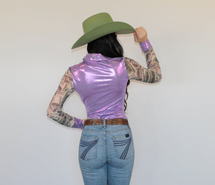 The All In Pearl Snap Rodeo Shirt is a long sleeve, body contouring, metallic lilac rodeo shirt made to turn heads under the arena lights. It features stretch mesh sleeves printed with a bold dollar bill motif, finished with a purple banded stretch cuff for both comfort and style. Silver pocket smile embroidery on the front, silver NS logo embroidery on the back collar, and sparkling rhinestone snap button closures bring the full flair of this rodeo glam piece to life!
