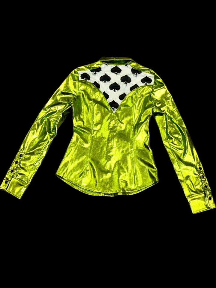 Unleash your inner wild card with the Smokin' Spades Western Pearl Snap Girls Rodeo Shirt. This bold statement piece features a striking lime green metallic bodice, accented by a smudged spade design on a pointed western yoke. The black pearl snap closure adds a classic touch, while the active cuffs and structured collar bring a modern edge. Tailored to perfection with a slim, contoured fit, this shirt doesn’t just wear – it commands attention. Handmade in small batches, this limited-edition piece is as rare as it is rebellious.  So bright, it shimmers at night!