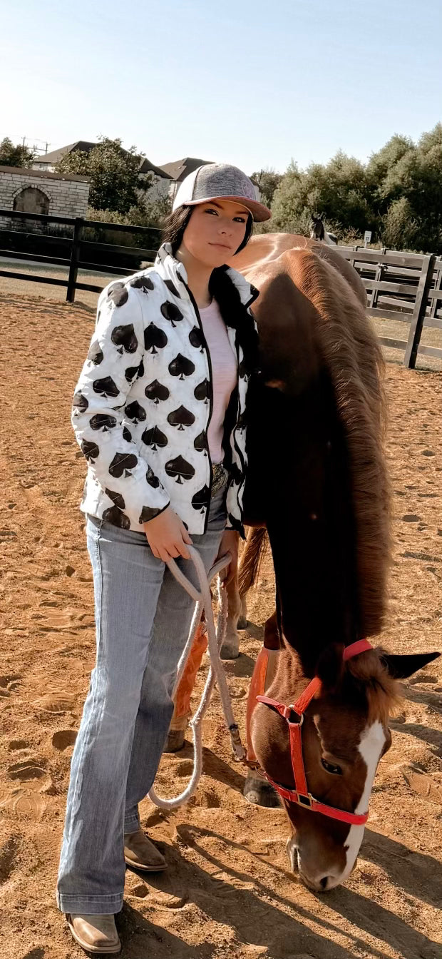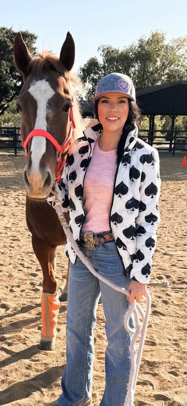 Get ready to turn heads and heat things up with our Smokin Spades Women’s Puffer Jacket—style and coziness in spades, literally! This lightweight layer is ready to roll whether you’re headed out on the town or braving the chill of a starry night. With a stand-up collar and quilted lining, this jacket's got more flair than a rodeo queen at high noon. The zippered pouch pockets are perfect for stashing your essentials, so you can ride through your day without breaking stride. It’s a go-to staple for gals who like to keep things wild, warm, and worry-free.  This puffer’s got you covered from sunup to sundown, ready for any adventure.