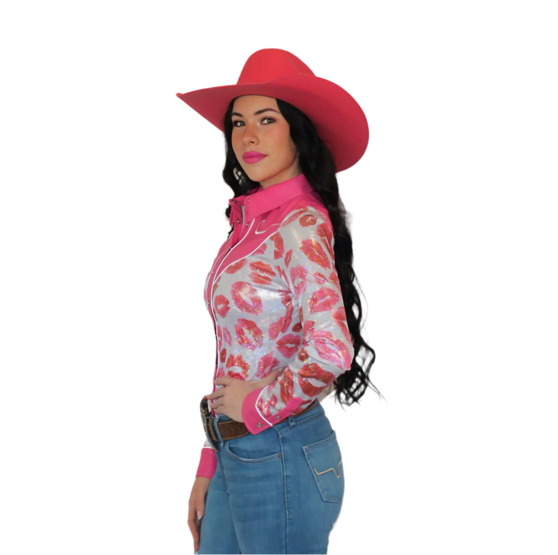 The Smooch & Spur Rodeo Shirt is where glam meets grit. Designed with a form-fitting, body-contour silhouette and crafted from buttery-soft 4-way stretch holographic fabric, this shirt moves with you—whether you're in the saddle or stealing the spotlight.