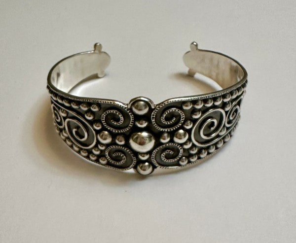 Silver beads and swirls stand out against an oxidized background on this vintage style cuff!