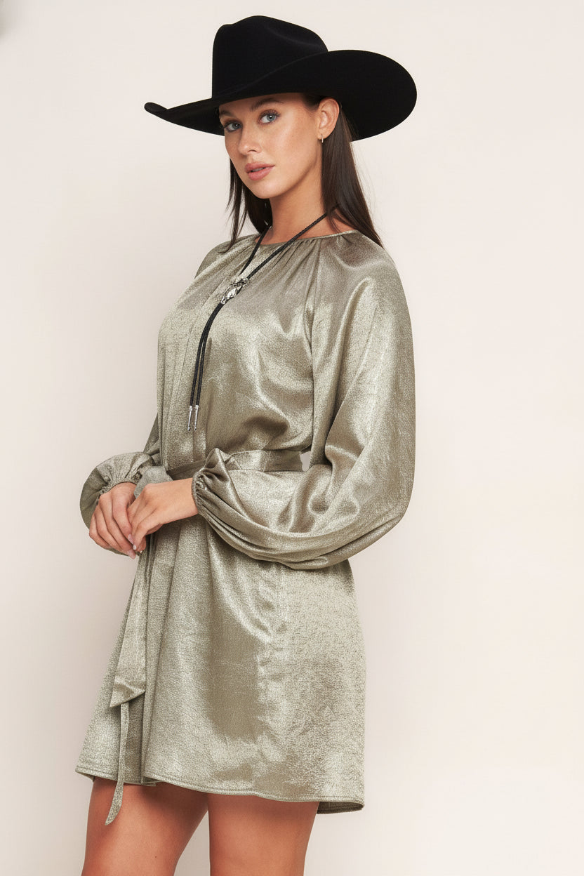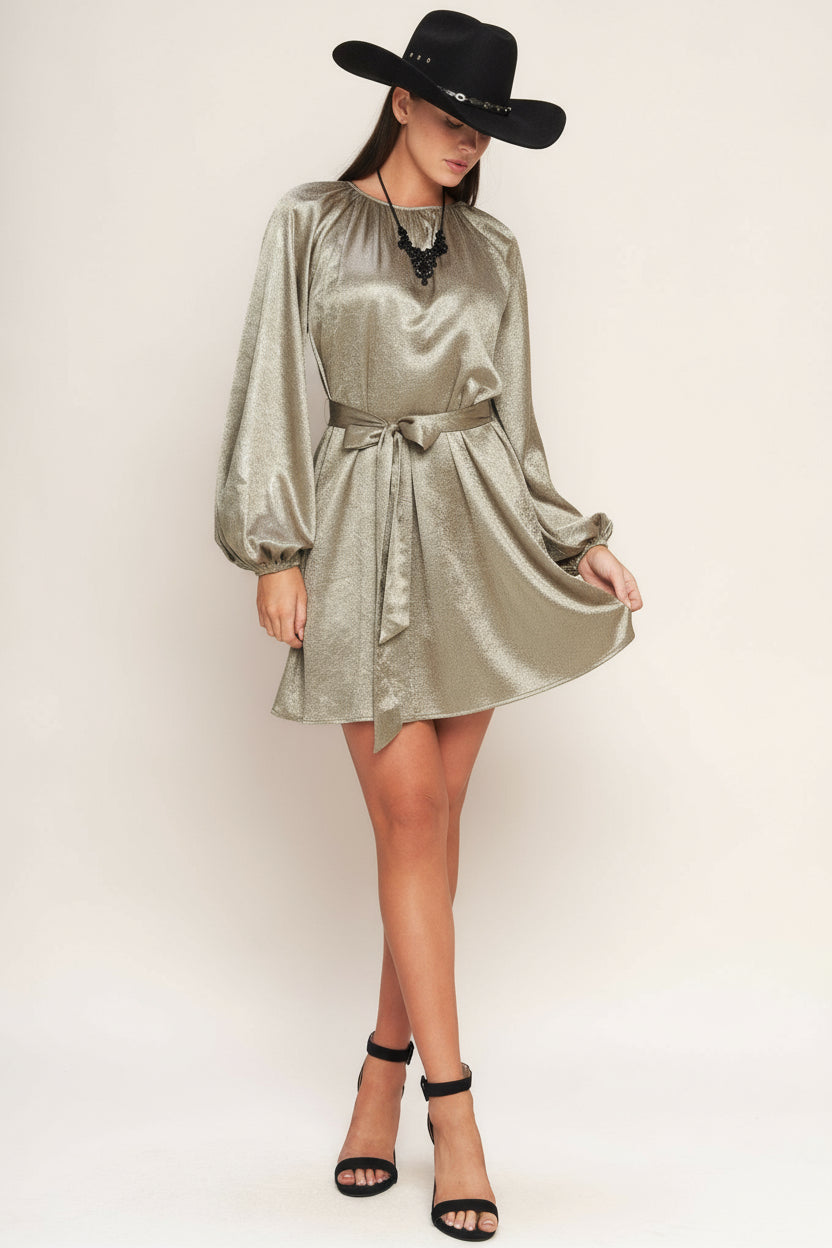 A foiled woven mini dress featuring round neckline, long sleeve, self sash tie and back neck button closure