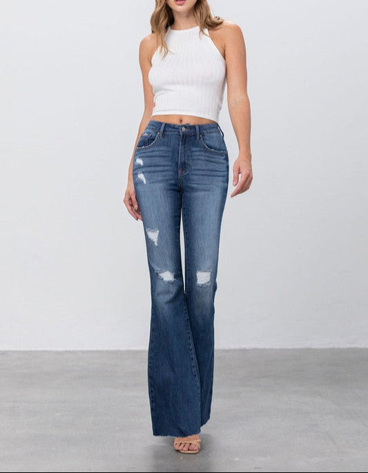 These dark wash flare jeans are the perfect blend of comfort and style. Designed with a mid-rise waist and wide flare silhouette, they create a flattering, elongated look. Crafted from a soft stretch blend, they move with you while keeping their shape. Finished with subtle distressed details and a classic button fly, they’re a versatile pick for casual wear.