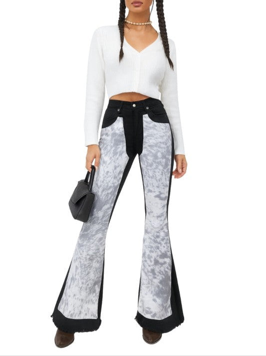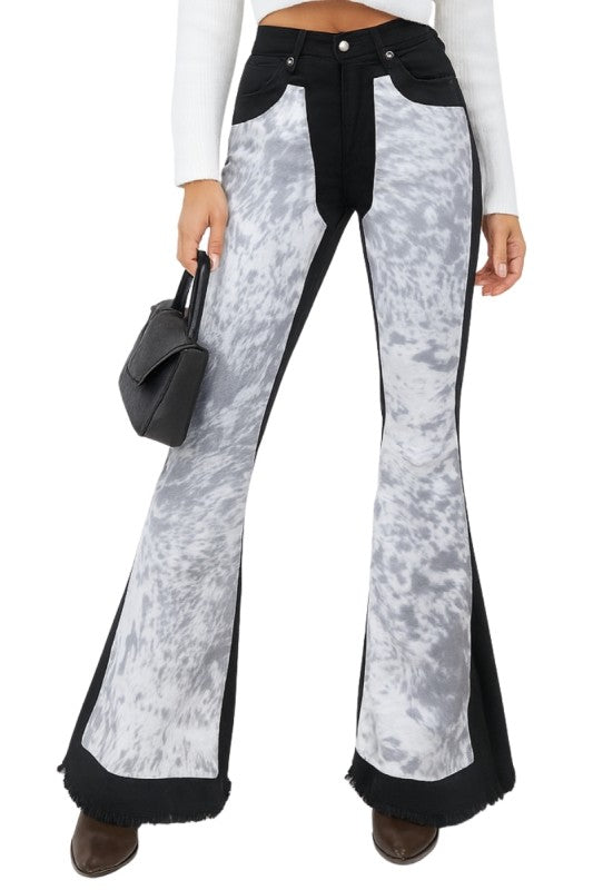 Turn heads in these statement-making women's flare jeans with cowhide front panels, blending bold Western style with modern edge. Featuring faux cowhide-inspired paneling, a flattering high-rise fit, and raw hem detailing, these jeans are perfect for festivals, concerts, or everyday streetwear with a rustic twist. The black denim base contrasts beautifully with the cowhide print, giving a chic yet rugged look that pairs effortlessly with boots or heels. Made with quality craftsmanship and designed for comfort, these standout flares bring cowboy glam to your wardrobe.
