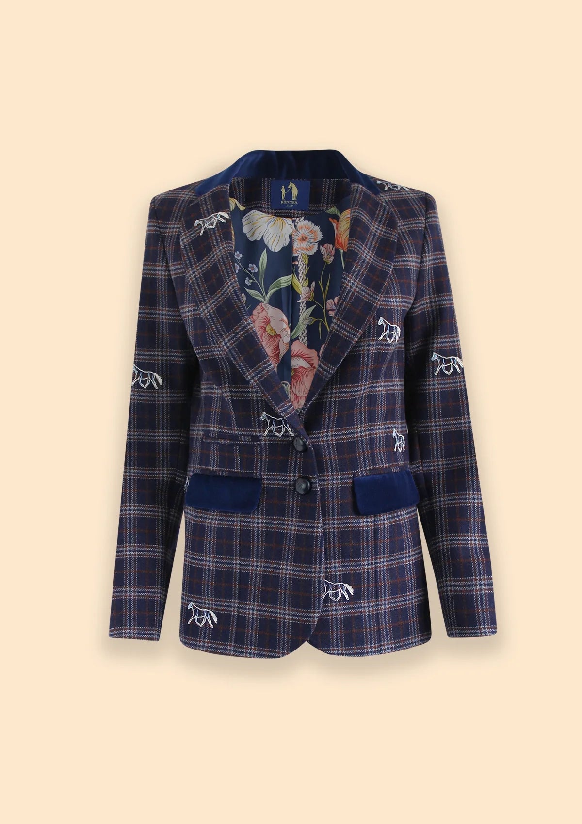 The Cavaletti Blazer brings timeless equestrian elegance to life. Made from fine Italian wool, it features delicate horse embroideries, velvet accents on the collar and pockets, and a charming floral lining.