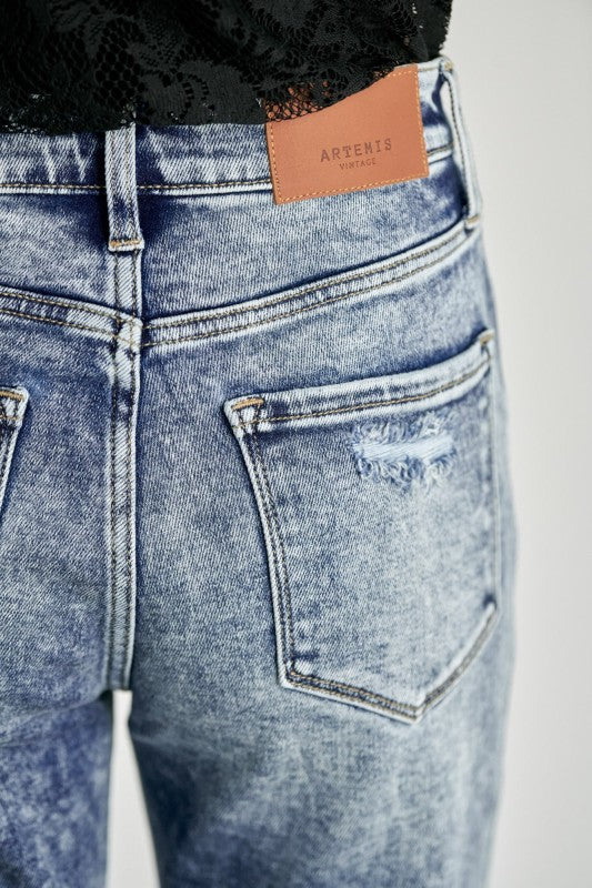 Meet your new everyday denim favorite. These jeans are crafted from comfort stretch denim that moves with you while keeping its shape wear after wear. Designed with a high rise fit and medium stone wash, they deliver that effortlessly lived-in look. Distressed details and a frayed hem add the perfect touch of edge, making them easy to dress up or down.