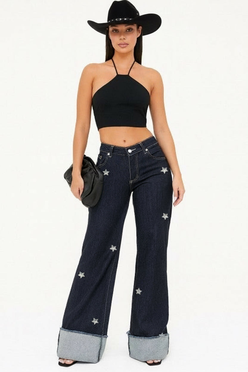 The low-rise silhouette and relaxed wide-leg fit create a flattering, elongating shape, while the bold oversized cuffed hem adds a fashion-forward finish inspired by Y2K and western-luxury trends. Each crystal star accent is carefully applied to catch the light, delivering subtle shine without sacrificing wearability.