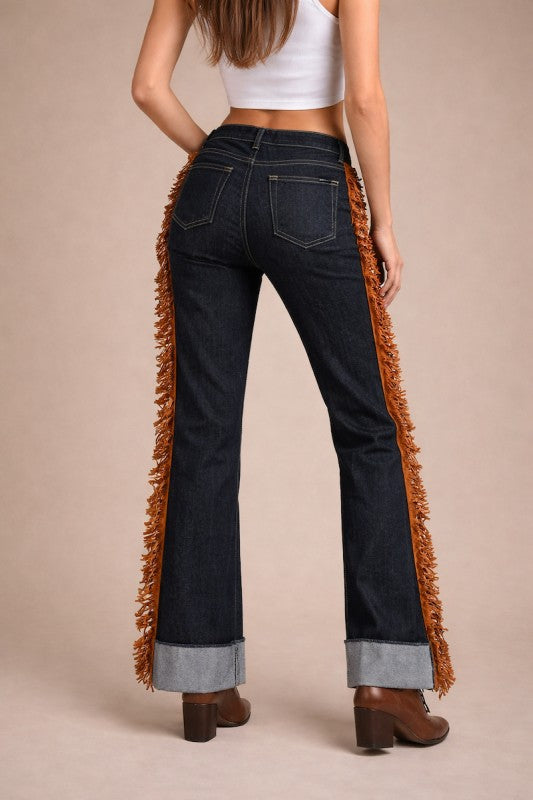 Turn heads in these low rise wide leg jeans, crafted from premium low-stretch denim designed to hold its shape wear after wear. Featuring bold western-inspired fringe detailing along the sides and a structured silhouette, these jeans deliver a flattering fit with a vintage edge. The durable denim provides just enough give while maintaining a sculpted look, making them perfect for everyday wear or styled up with boots for a statement outfit. Proudly made in the USA with attention to quality, fit, and long-lasting construction.