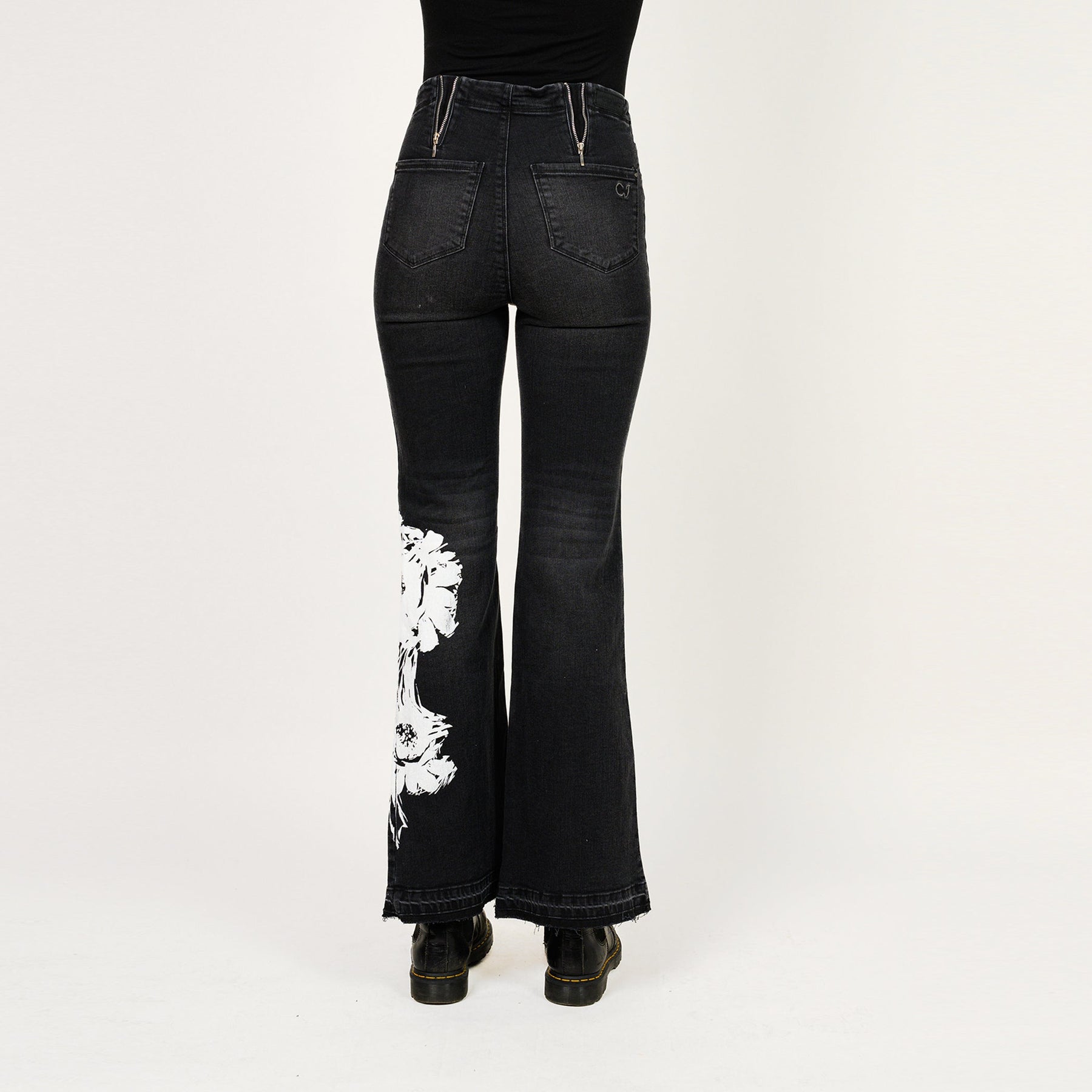 Our premium stone wash black denim combined with a bold screen print placement white flower at the side of the leg, make this bootcut create a statement like no other.