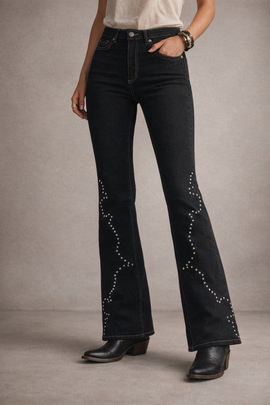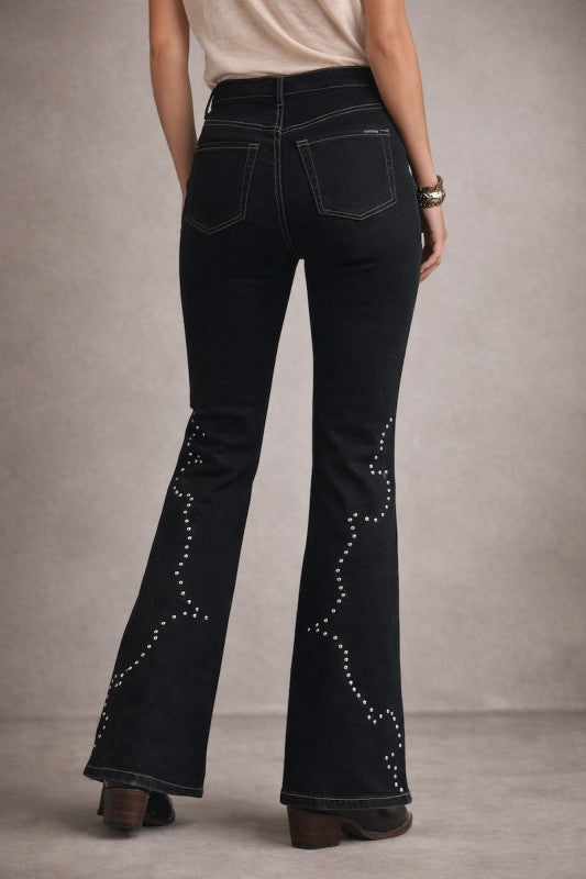 Designed to stand out, these Made in USA boot-cut jeans feature hundreds of hand-pressed studs placed with precision along the leg for a striking yet refined western-inspired look. Crafted from premium stretch denim, they offer a flattering fit that hugs through the hip and thigh before breaking into a classic boot-cut silhouette-perfect for pairing with heels or western boots.