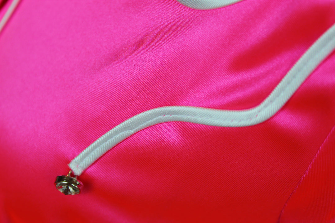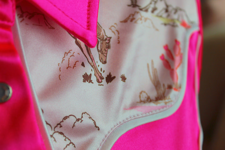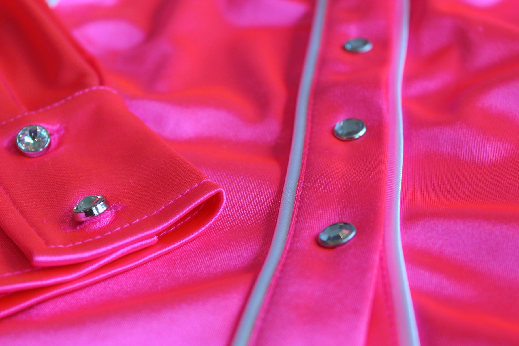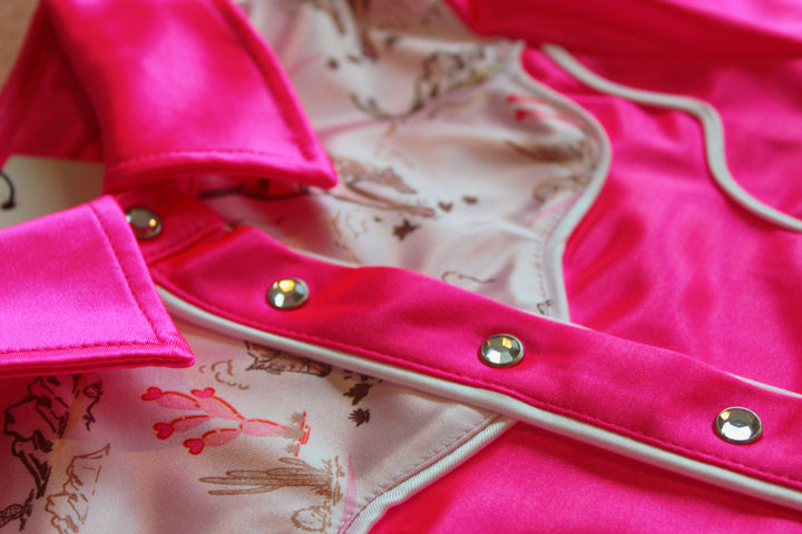 Get ready to command the spotlight in the Let 'Er Buck Luxury Rodeo Shirt, a dazzling blend of classic Western charm and high-end modern style. Crafted from premium Italian fabric, this piece is designed in vibrant neon pink stretch satin that moves with you, offering comfort and durability. Luxe touches like premium rhinestone buttons and snaps add that extra touch of sparkle, while white piping on the waist, yoke and chest defines its sharp, Western lines.