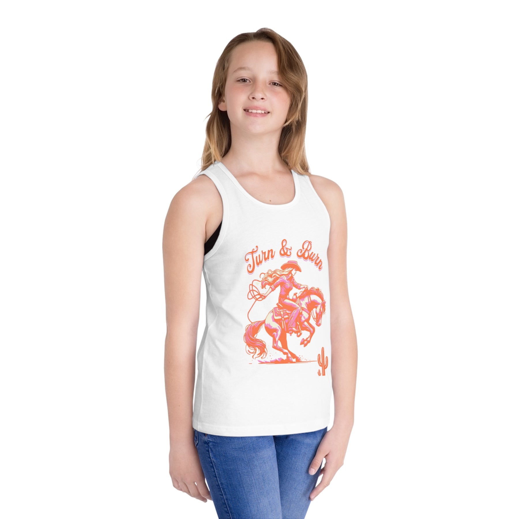 Giddy up, cowgirl! Our “Turn & Burn” Girls Tank Top is made for those who live life in the fast lane. This tank’s got your back with a light, breezy feel that’s perfect for when you’re ready to kick up dust and hit the gas. The front’s got a bold “Turn & Burn” slogan that says you’re not just here to ride—you’re here to blaze your own trail.