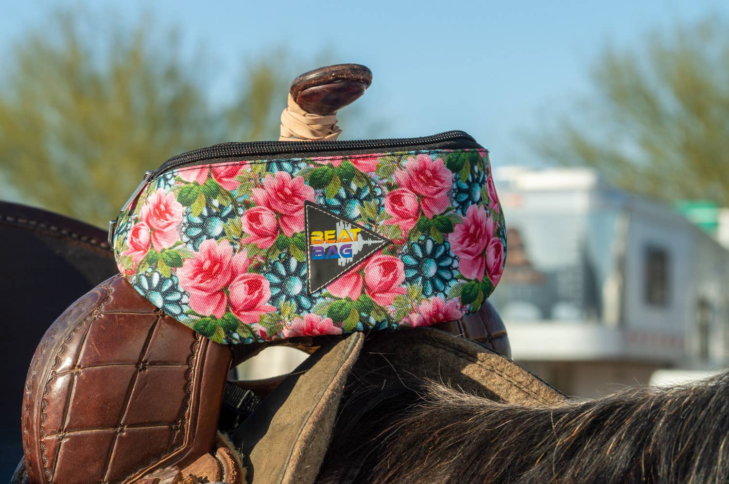 The Beat Bag is a saddle pouch equipped with 2 rechargeable blue tooth speakers ready to play your music or to amplify your coaches voice while riding. The beat bag is insulated front and back to keep your items safe while riding, has 2 nylon straps with clips to attach to your saddle pommel, 2 clips to clip to your belt loops or english saddle. The bluetooth speakers easily connect to your device by selecting "Beat Bag" in the bluetooth options, and comes with USB cord to recharge the speakers. Use while riding, biking or running or any other activity that needs a beat!!!