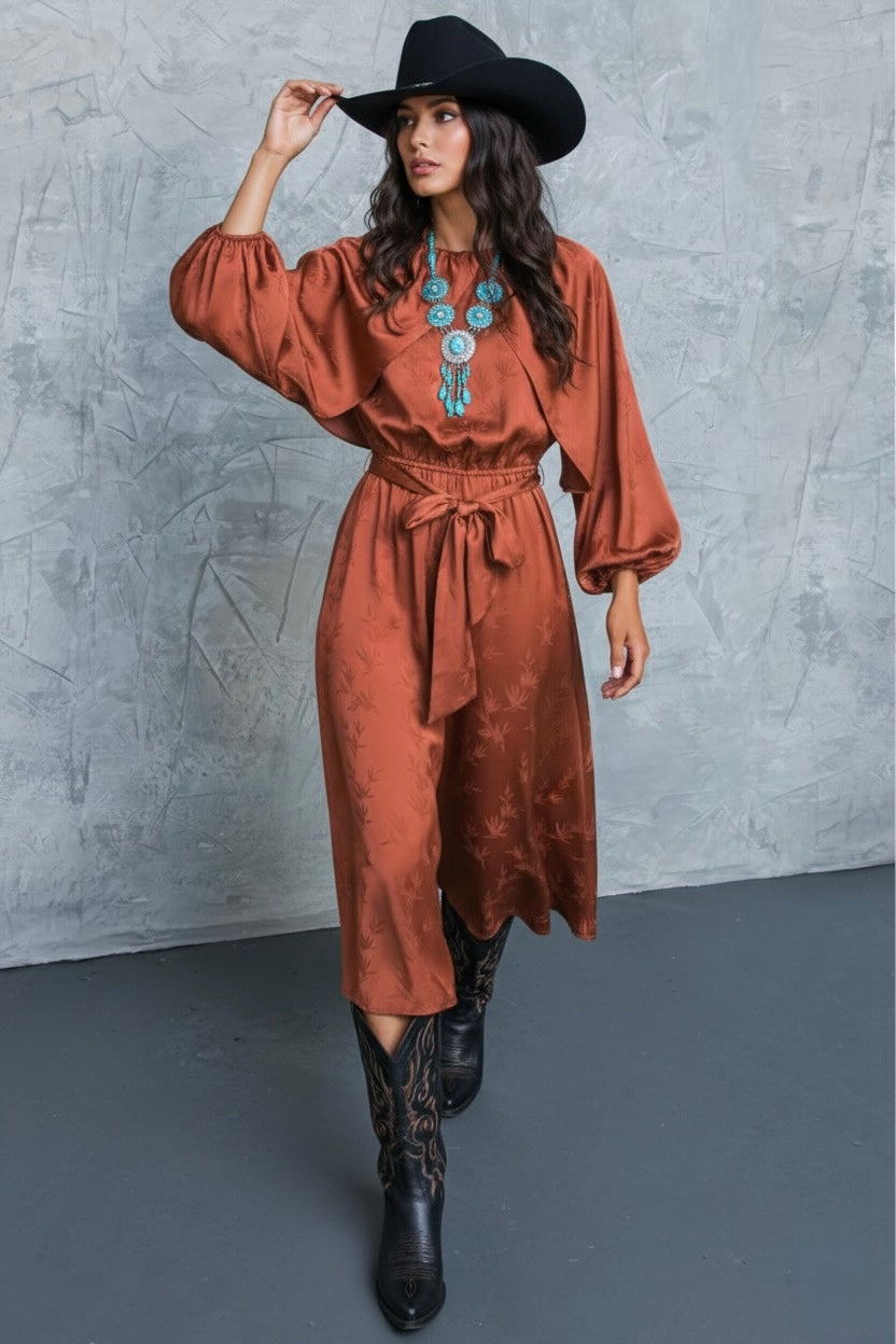 A woven jacquard satin midi dress featuring round neckline, additional long sleeve layer, elasticized waist with self sash tie, full skirt and back neck button closure