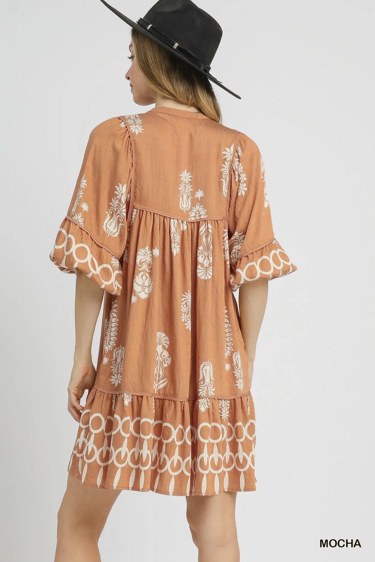 Make a statement in the Boarder Print Tassel Tie Neck Mini Dress. This dress features a vibrant border print design and tassel tie neck for a bohemian flair. Perfect for a summer day out or a beach vacation. Pair it with sandals or espadrilles for a laid-back and stylish look.