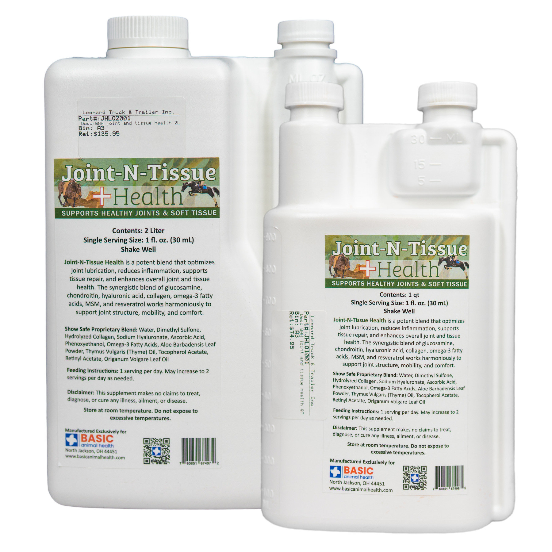 Joint-N-Tissue Health is a potent blend that optimizes joint lubrications, reduces inflammations, supports tissue repair, and enhances overall joint and tissue health. The synergistic blend of glucosamine, chondroitin hyaluronic acid, collagen, omega-3 fatty acids, and MSM, works harmoniously to support joint structure, mobility, and comfort. It is available in a liquid both a 2L & Quart.