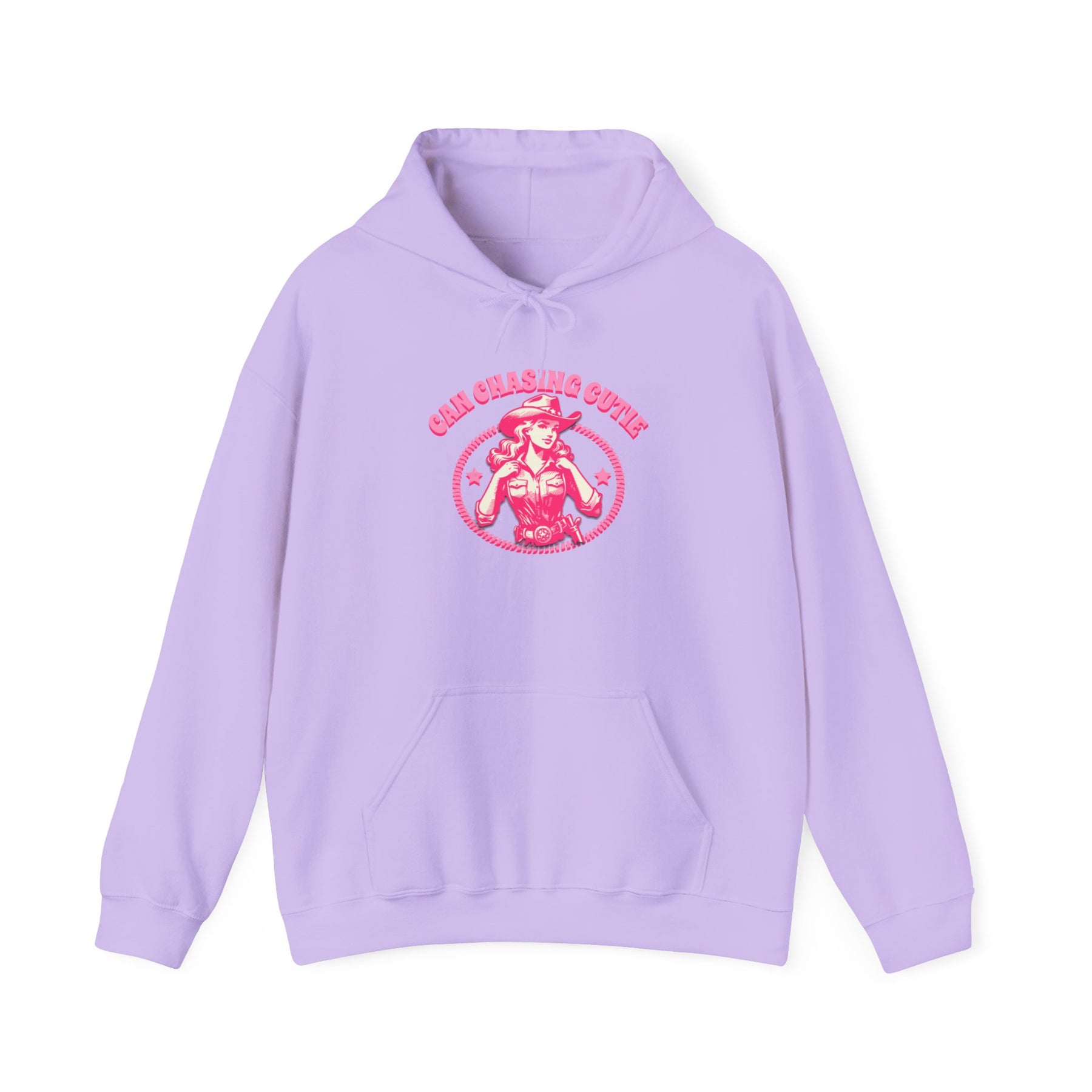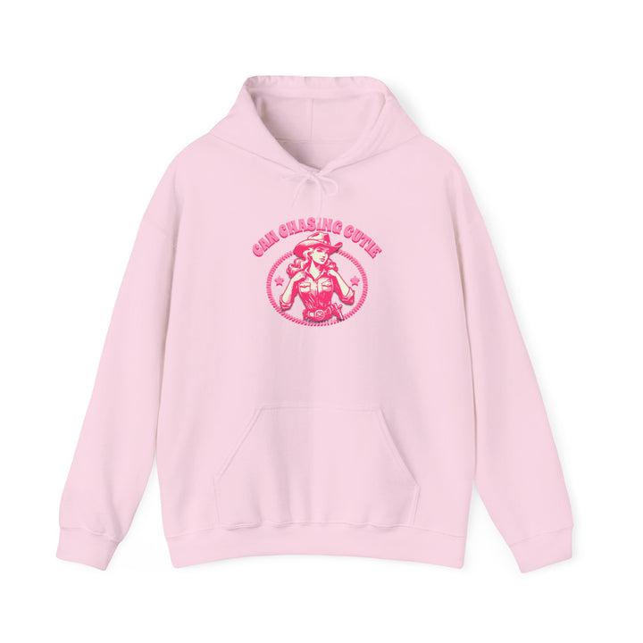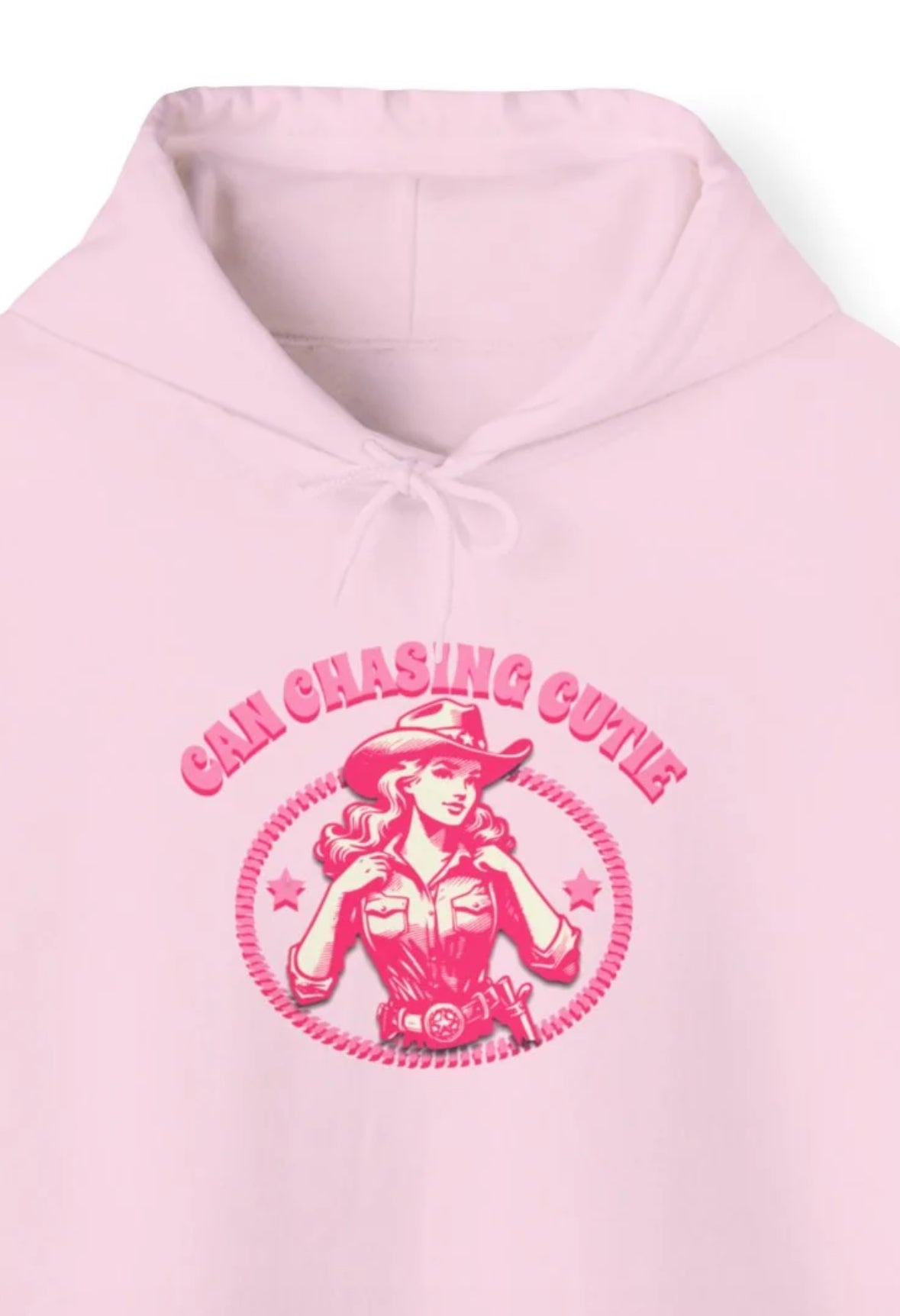 With a roomy kangaroo pocket for added convenience and a matching drawstring hood for extra flair, this sweatshirt is both practical and stylish. Whether you're cheering on a rodeo or kicking back in casual comfort, the "Can Chasing Cutie" hoodie is perfect for barrel racers, fans and western style lovers alike.