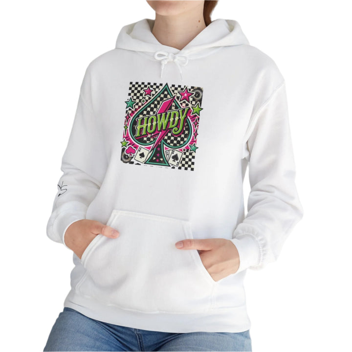 Strut your stuff in this here Electrified Howdy Spade Hoodie, where comfort meets Western charm with a jolt of playful flair. Whether you're kickin' up dust at the rodeo or just takin' it easy in town, this cozy Unisex Heavy Blend™ Hooded Sweatshirt is built for comfort, style, and a whole heap of personality. The bold spade design says "howdy" loud and proud, while the buttery-soft fabric keeps ya snug as a bug in a rug, no matter the season.