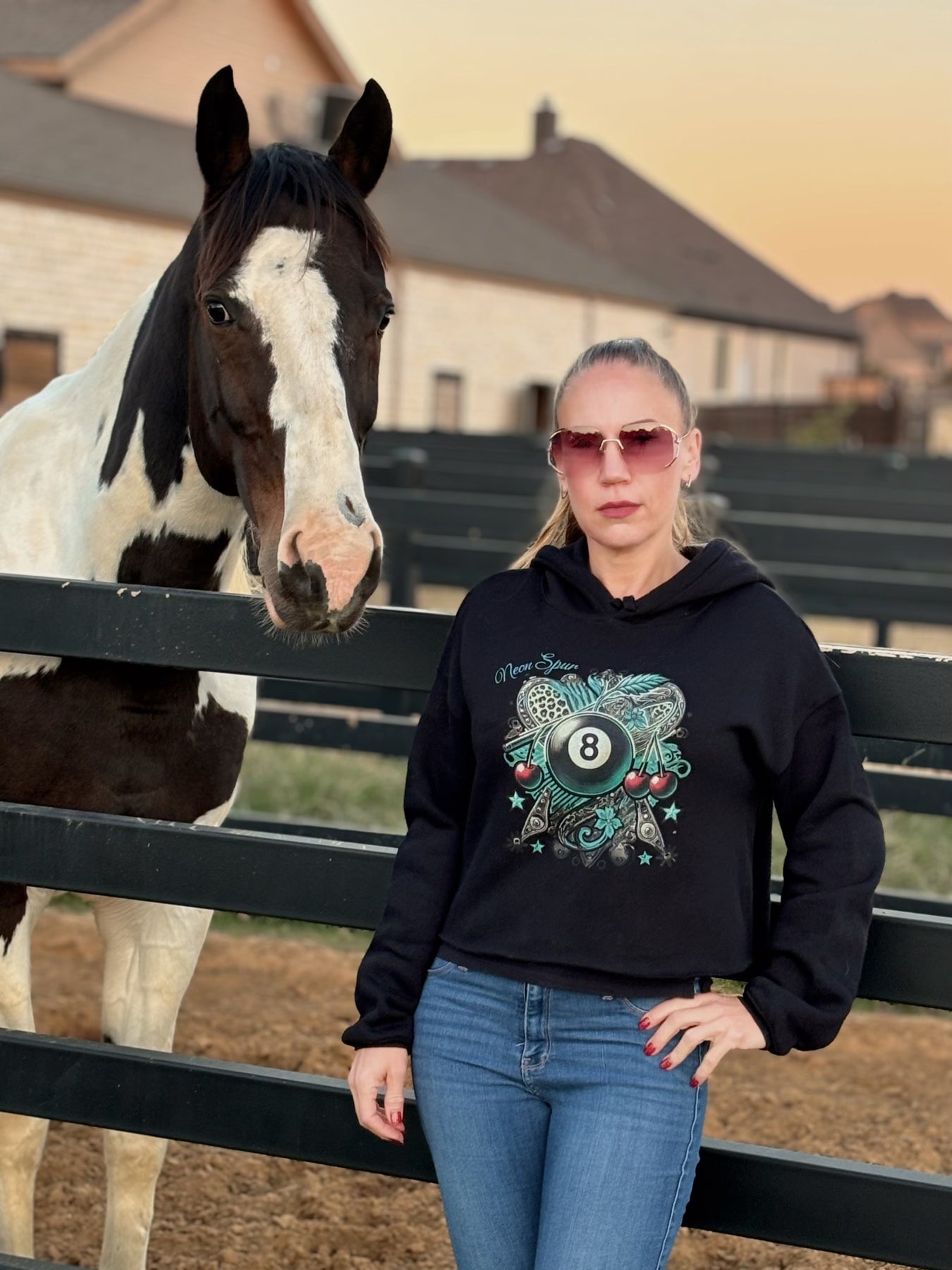The Lucky 8 Crop Fleece Hoodie is your new favorite piece for laid-back style with a lucky twist. Featuring the bold 8-ball graphic with spurs, cherries, and a touch of cheetah print, this hoodie brings a playful vibe to Western wear. Made from ultra-soft fleece and cut in a trendy cropped length, it’s perfect for layering or wearing solo on cooler days. Whether you’re feeling lucky or just love a bit of flair, the Lucky 8 Crop Hoodie is here to add that extra charm to your wardrobe!
