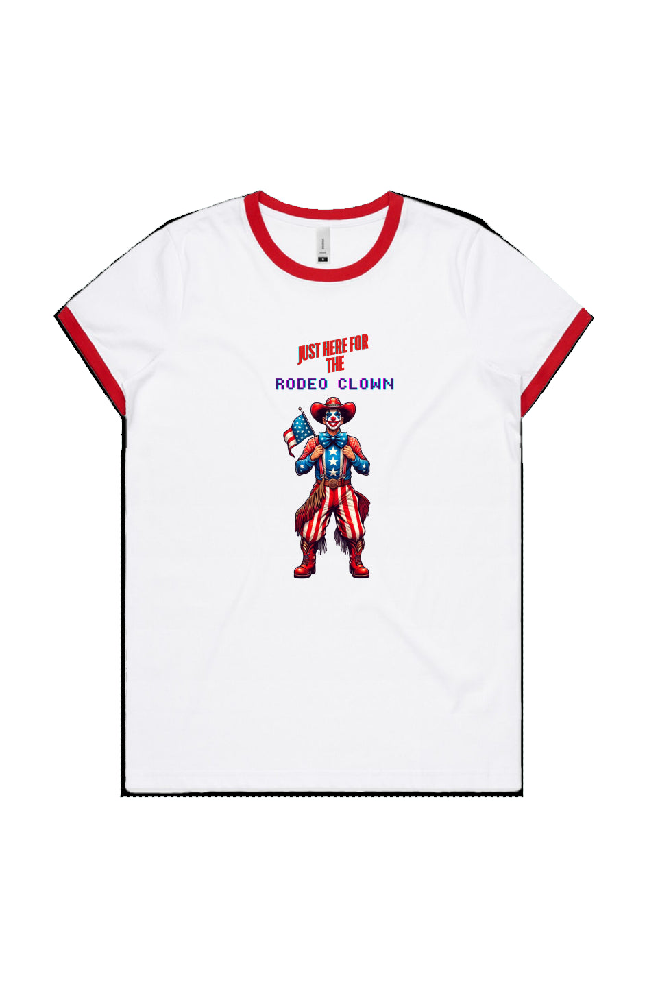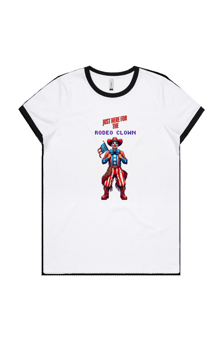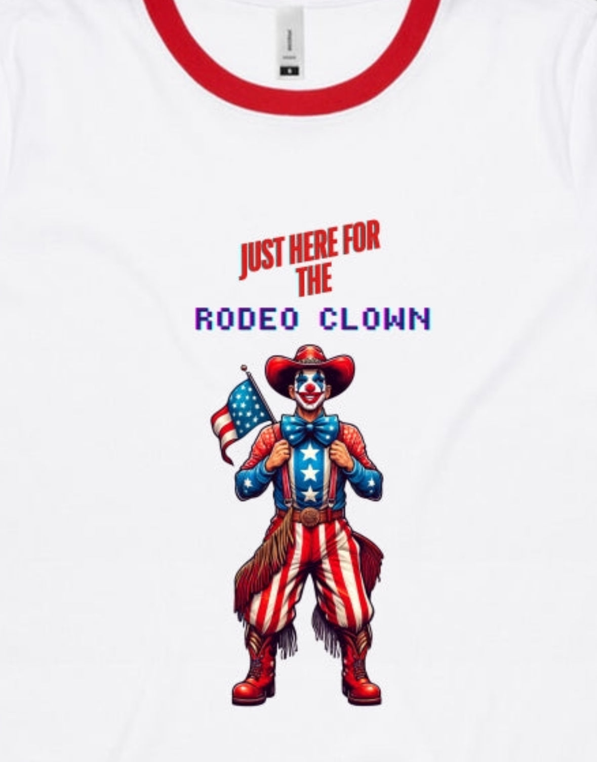Well, darlin’, if there’s one thing that makes a rodeo worth watchin’, it’s the fella keepin’ the dust stirred and the bulls distracted—the rodeo clown! This Just Here for the Rodeo Clown Ringer Tee is for the cowgirl who knows that sometimes the best show ain’t the ride but the rescue.