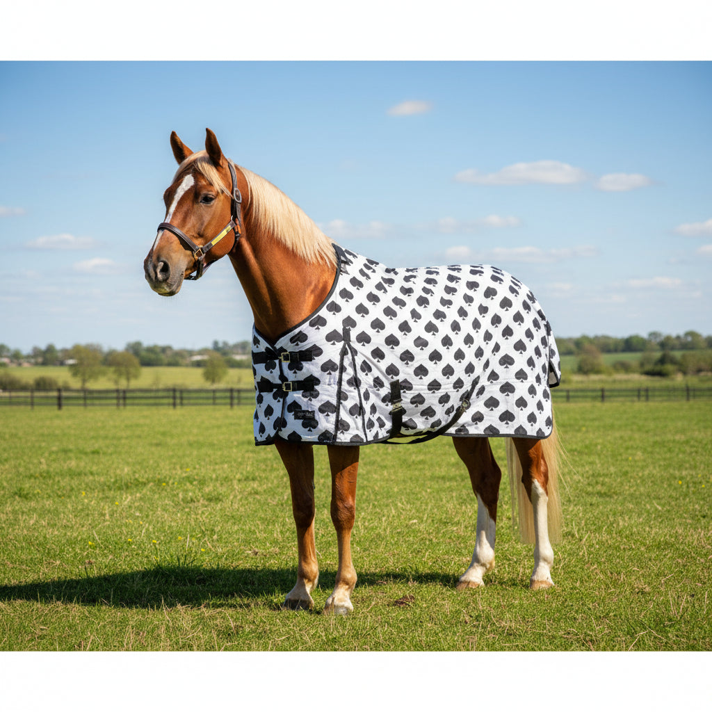 Keep your horse warm, dry, and ready to roll with the Smokin Spades 350g Fill 1200 Denier Winter Blanket — a tough, waterproof, and stylish essential for unpredictable weather. Crafted from durable 1200 Denier fabric reinforced with 15mm neoprene polyester, this blanket delivers exceptional shockproof and compression-resistant protection. With 350 grams of insulating fill, it offers the perfect balance between warmth and breathability for cooler days. Designed for movement and longevity, it features closed slits at the front legs for greater agility, a secure dual-strap belly closure, and replaceable adjustable hind leg straps. Finished with a tail cover for added protection and Velcro strips at the chest for easy on-and-off, this blanket is as practical as it is protective — and it cleans up beautifully (cleans well.)