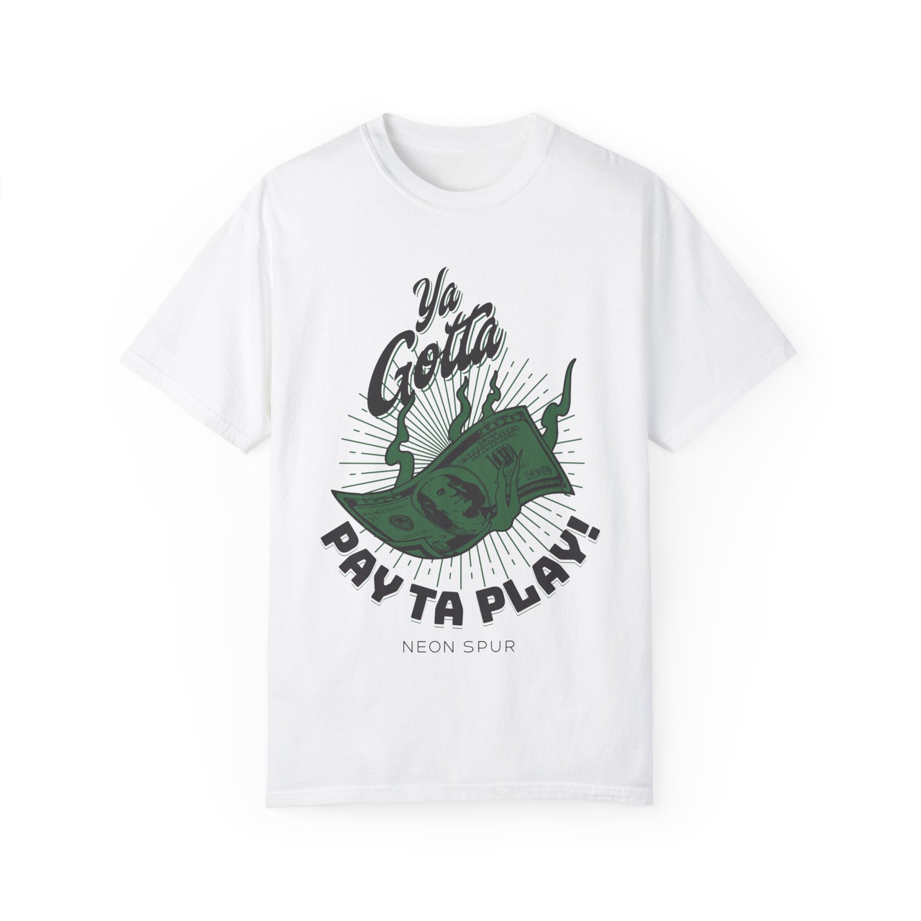 The Ya Gotta Pay Ta Play! T-Shirt from Neon Spur is the perfect addition to any modern Western wardrobe. Designed for those who live life to the fullest and embrace the hustle, this shirt showcases the bold slogan with a playful attitude. Made from soft, breathable fabric, it ensures all-day comfort whether you're out wranglin' cattle or kickin' back with friends. This classic fit tee pairs perfectly with jeans or your favorite rodeo gear, making it a go-to piece for anyone who knows the true cost of living big and playing hard!