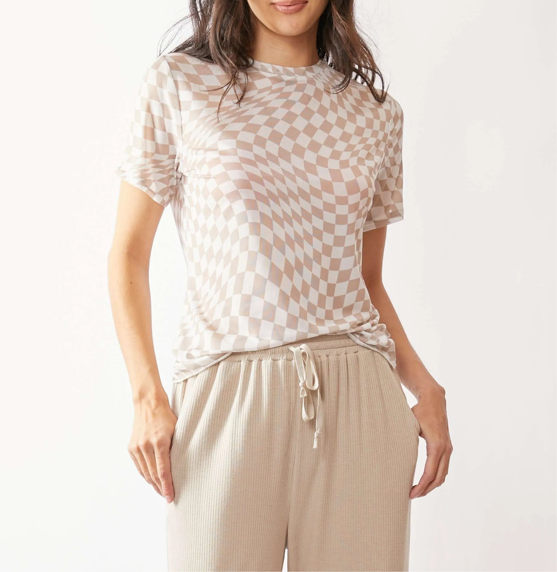 Neutral Checker Print Mesh Short Sleeve Top