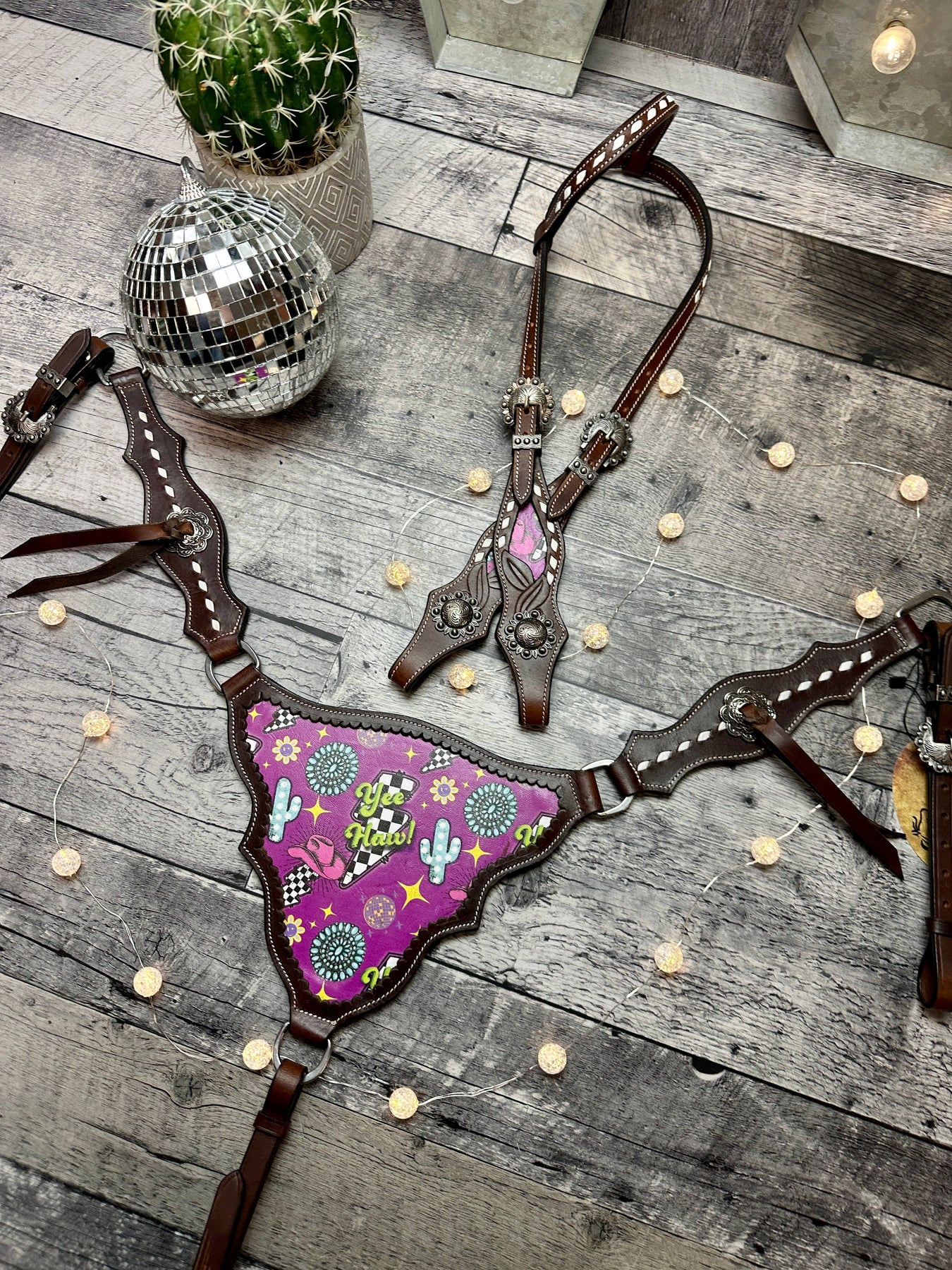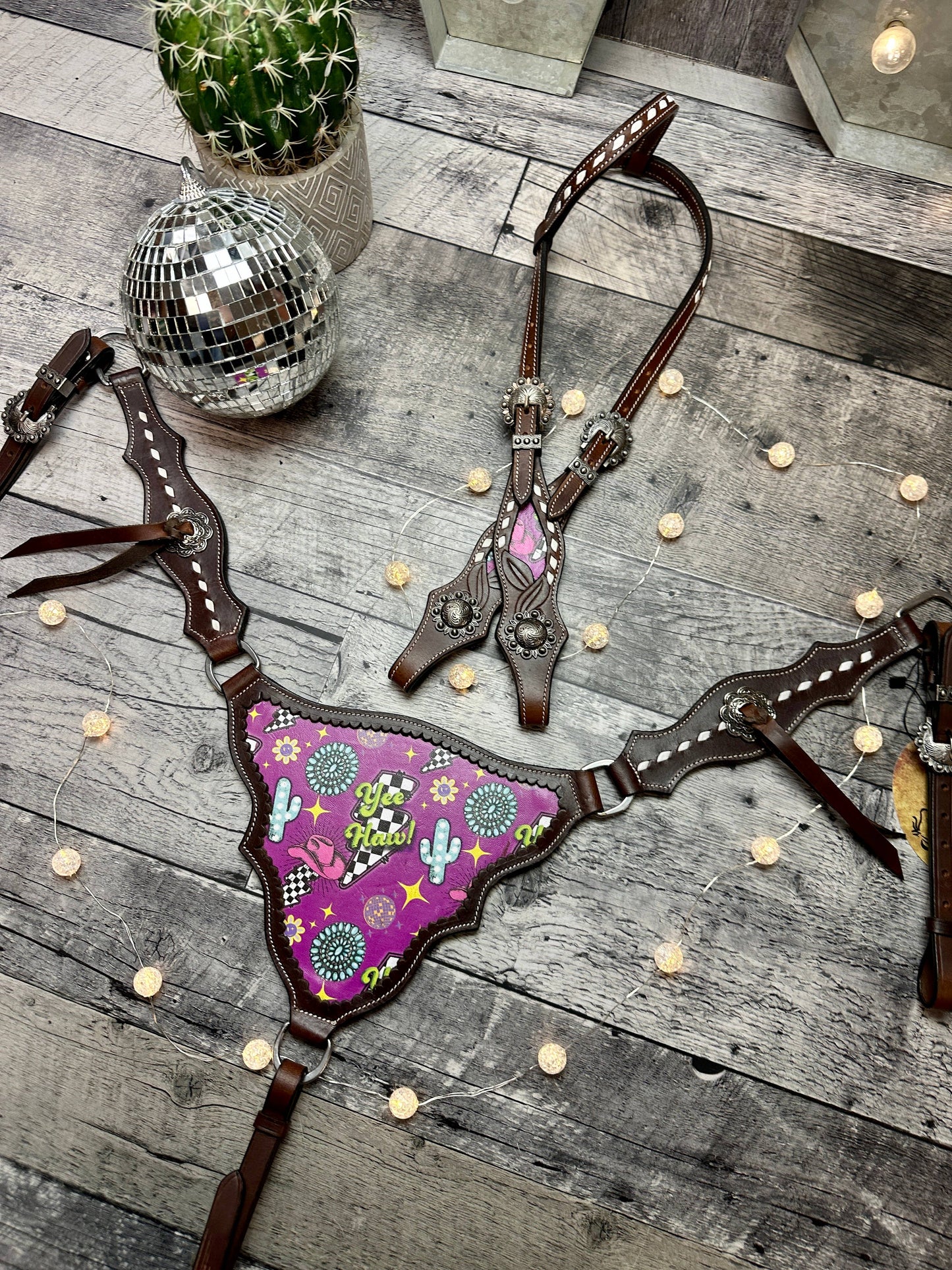 Crafted from beautiful dark oil leather, this set features a classic 3-piece style breast collar with crisp white buck stitch accents and slotted conchos tied with leather for an authentic finish. The showstopper? The exclusive Neon Yeehaw print leather inlay, lighting up the center piece with western flair.