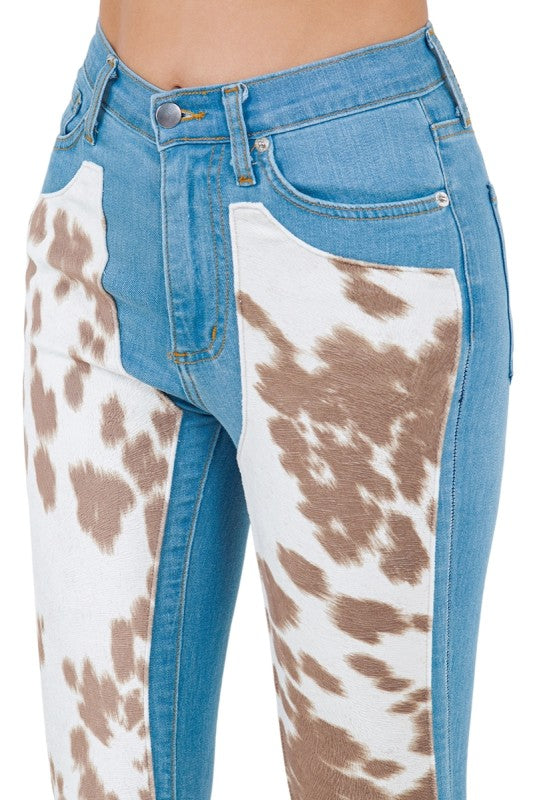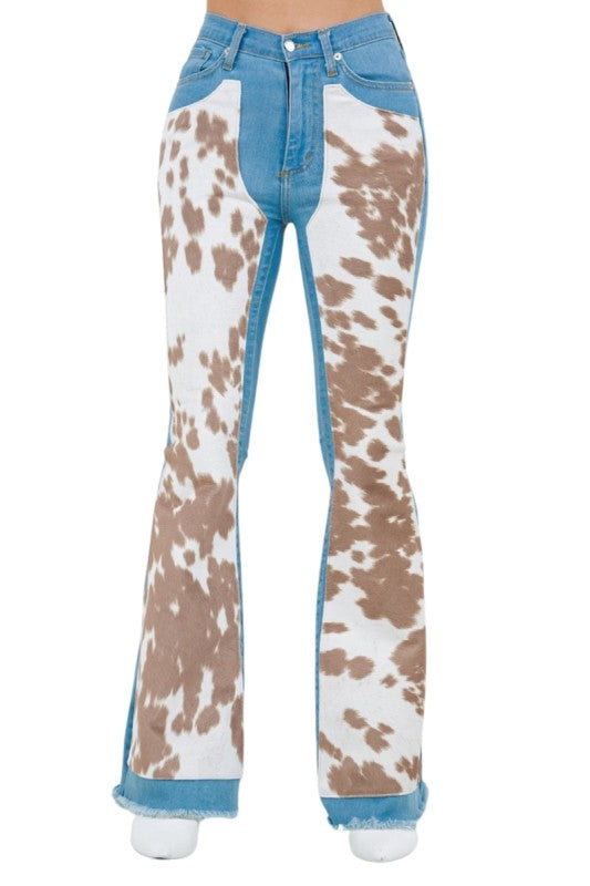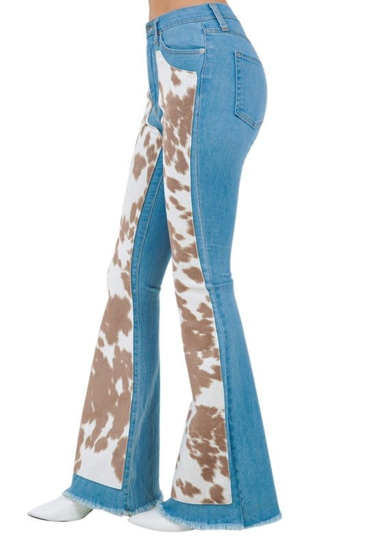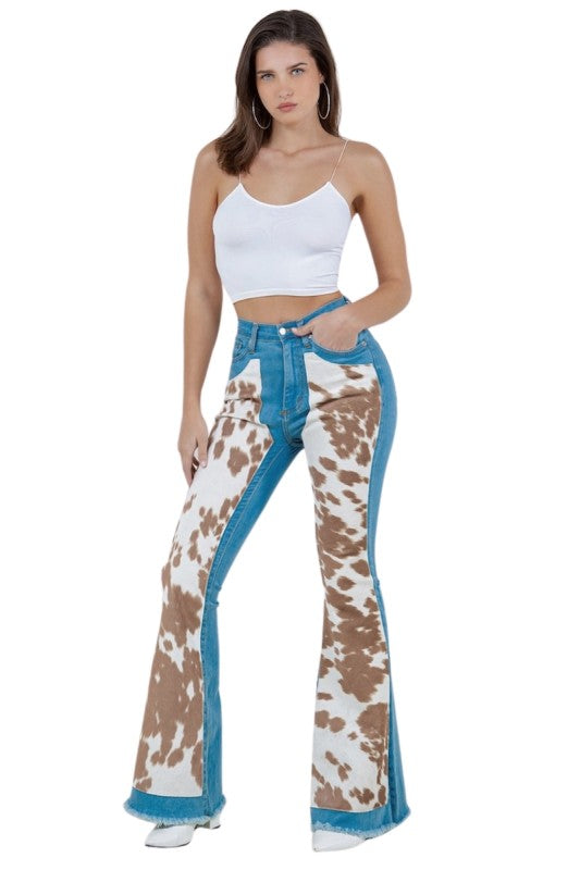 Ride into style with our Rodeo Bell Bottom Jean! These Western-inspired jeans elevate any outfit with front faux cow hide inserts and a flattering 34" inseam length. Made in the USA with stretch denim, they're as comfortable as they are stylish. Moo-ve over, basic jeans!